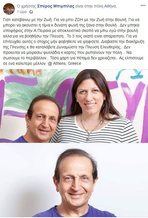 Υποψήφιος με την «Πλεύση Ελευθερίας – Ζωή Κωνσταντοπούλου» θα είναι στις εκλογές ο ηθοποιός Σπύρος Μπιμπίλας, όπως έκανε γνωστό μέσω των social media.«Γιατί κατεβαίνω με την Ζωή. Για να μπει ζωή με την Ζωή στη Βουλή. Για να μπορεί να ακουστεί η τίμια και δυνατή φωνή της ξανά στη Βουλή. Δεν μπήκα υποψήφιος στην Α’ Πειραιά με αποκλειστικό σκοπό να μπω εγώ στη Βουλή, αλλά για να βοηθήσω την Πλεύση», αναφέρει –μεταξύ άλλων- στη σελίδα του στο Facebook.