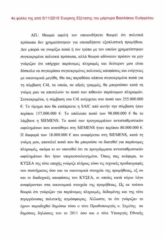 Σε άλλο σημείο επισημαίνει: «Η προσωπική μου εκτίμηση είναι ότι ο κ. Σημίτης γνώριζε και γνωρίζει για παράνομες πληρωμές στην προμήθεια του C4I, ιδίως προς τον τότε Υπουργό Εθνικής Άμυνας κ. Παπαντωνίου».
