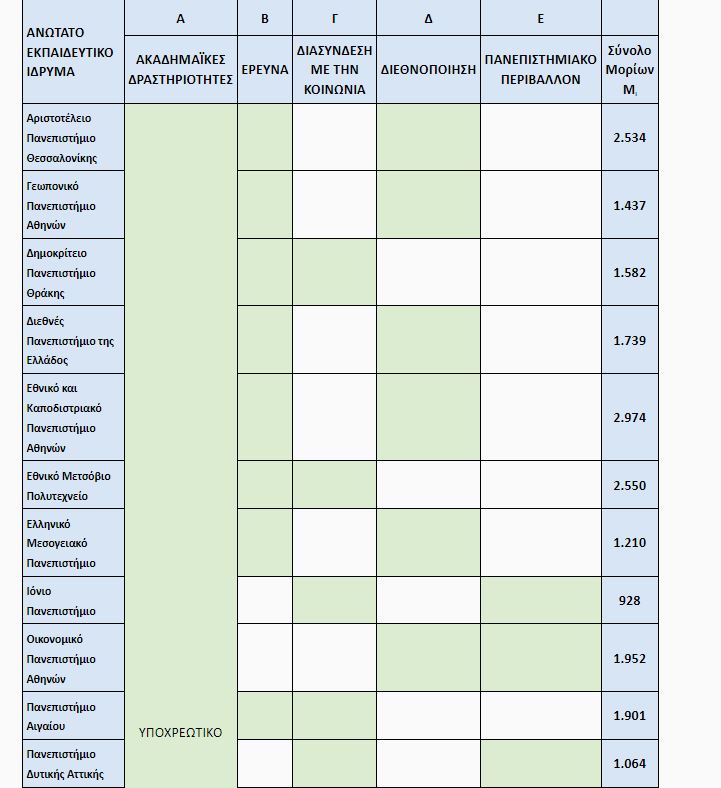 ΠΙΝΑΚΑΣ Επιλογή ενοτήτων κριτηρίων από τα ΑΕΙ και συνολική μοριοδότησή τους σύμφωνα με τα ποιοτικά κριτήρια