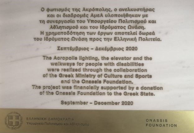 Σε σχετική ανακοίνωση, ο Σύλλογος Ελλήνων Αρχαιολόγων τονίζει πως “αυτό που συμφωνήθηκε στο άρθρο 9 -και δεν έχει προηγούμενο- είναι η αναγραφή του χορηγού όσο και του πολιτικού προϊσταμένου, επί της θητείας του οποίου έγινε η χορηγία, σε μαρμάρινη στήλη εντός του μνημείου! Πρόκειται βεβαίως για μια εκ νέου χάραξη σε μάρμαρο ονόματος φυσικού προσώπου 1700 χρόνια μετά από τα τελευταία ονόματα των αναθετών της ύστερης αρχαιότητας!” και προσθέτει: “Η Ακρόπολη, το κορυφαίο μνημείο παγκόσμιας πολιτιστικής κληρονομιάς, πρέπει να προστατευτεί από την ύβρι της πρόσκαιρης πολιτικής ηγεσίας του ΥΠΠΟΑ. Ο Σύλλογος Ελλήνων Αρχαιολόγων καλεί το ΚΑΣ και τις Υπηρεσίες του Υπουργείου Πολιτισμού με αρμοδιότητα στην Ακρόπολη να μην επιτρέψουν αυτή την ύβρι να χαραχθεί στην Ακρόπολη. Καλούμε το νομικό κόσμο τη χώρας να εξετάσει τις απαράδεκτες ενέργειες της πολιτικής ηγεσίας του ΥΠΠΟΑ”.