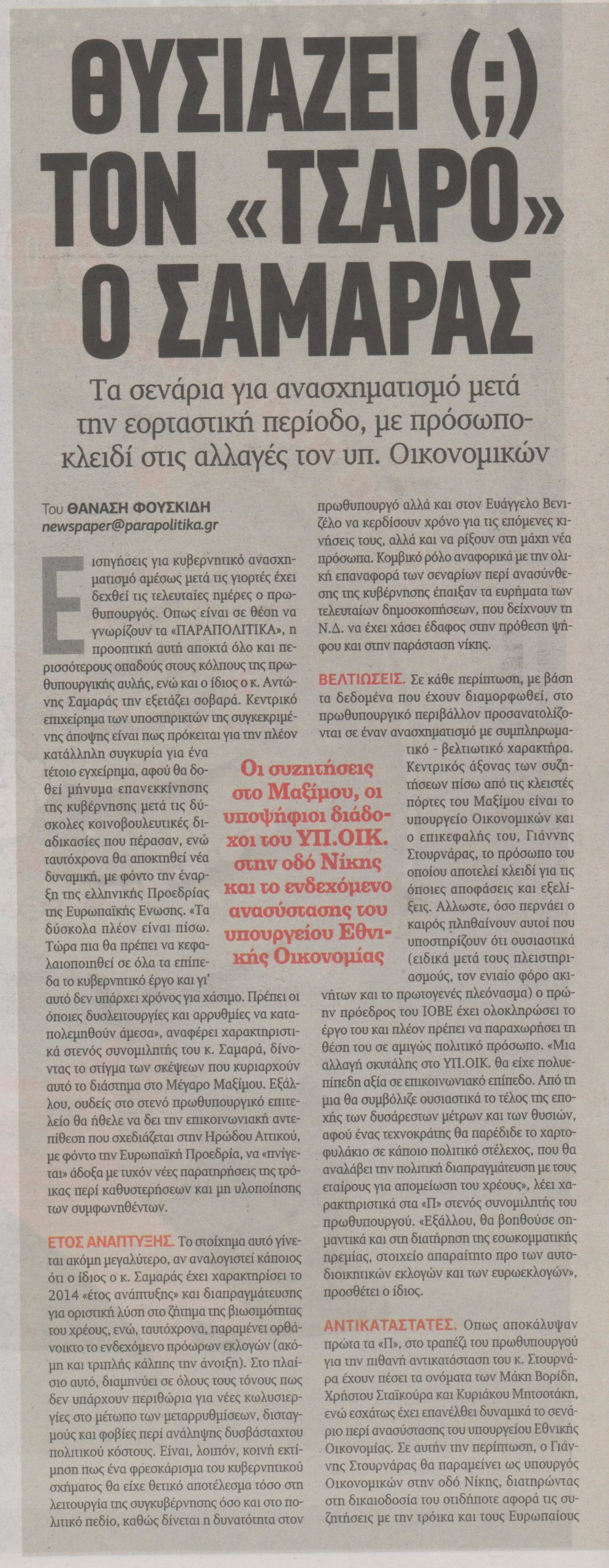 Όπως είναι σε θέση να γνωρίζουν τα «ΠΑΡΑΠΟΛΙΤΙΚΑ», η προοπτική αυτή αποκτά όλο και περισσότερους οπαδούς στους κόλπους της πρωθυπουργικής αυλής, ενώ και ο ίδιος ο Αντώνης Σαμαράς την εξετάζει σοβαρά.