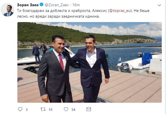 Ο Πρωθυπουργός της ΠΓΔΜ, Ζόραν Ζάεφ, ανέβασε στον λογαριασμό του στο twitter μία φωτογραφία με τον Έλληνα Πρωθυπουργό, ο οποίος τον υποδέχθηκε στις Πρέσπες.