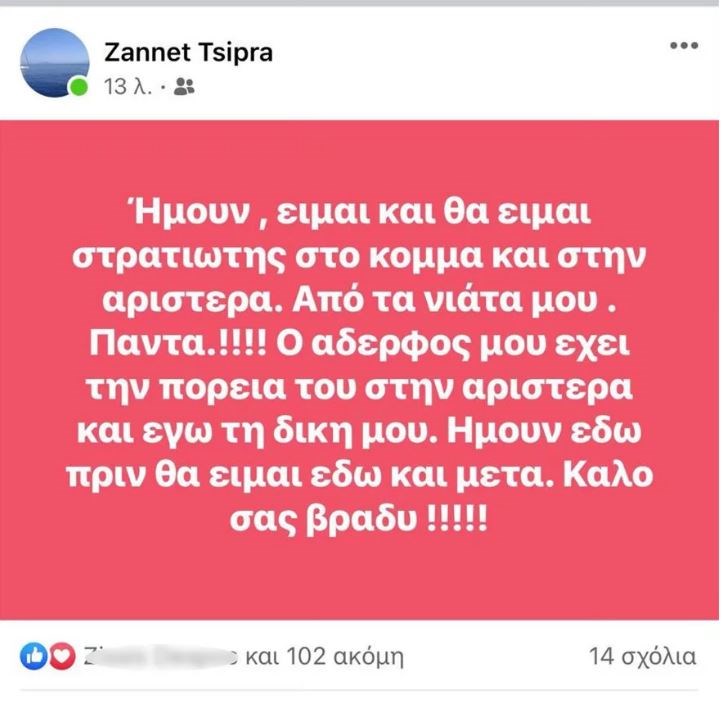 Για την πορεία της στην Αριστερά και τον αδελφό της, Αλέξη Τσίπρα έκανε ανάρτηση στα social media η Ζανέτ Τσίπρα. “Ήμουν εδώ πριν, θα είμαι εδώ και μετά” έγραψε χαρακτηριστικά η αδελφή του προέδρου του ΣΥΡΙΖΑ. Ολόκληρη η ανάρτησή της αναφέρει το εξής: