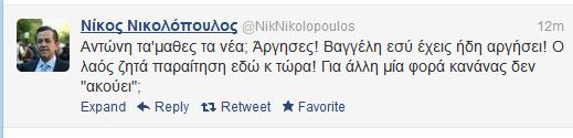 Την παραίτηση του Ευάγγελου Μεϊμαράκη ζητά ο βουλευτής Αχαΐας Νίκος Νικολόπουλος, με αφορμή τις αποκαλύψεις της Real News.”Αντώνη τα’μαθες τα νέα; Άργησες! Βαγγέλη εσύ έχεις ήδη αργήσει! Ο λαός ζητά παραίτηση εδώ και τώρα! Για άλλη μία φορά κανένας δεν “ακούει”, έγραψε πριν από λίγο ο κ. Νικολόπουλος στο Twitter.
