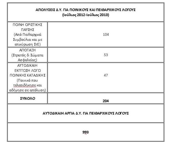 Σύμφωνα με τα στοιχεία που έδωσε στη δημοσιότητα το υπουργείο, μόνο τον τελευταίο μήνα απολύθηκαν για σοβαρούς ποινικούς και πειθαρχικούς λόγους 104 δημόσιοι υπάλληλοι ανεβάζοντας το συνολικό αριθμό από τον Ιούλιο του 2012 σε 204, ενώ οι υπάλληλοι που έχουν τεθεί σε αυτοδίκαιη αργία το ίδιο χρονικό διάστημα (Ιούλιος 2012 – Ιούλιος 2013) ανέρχεται σε 993.