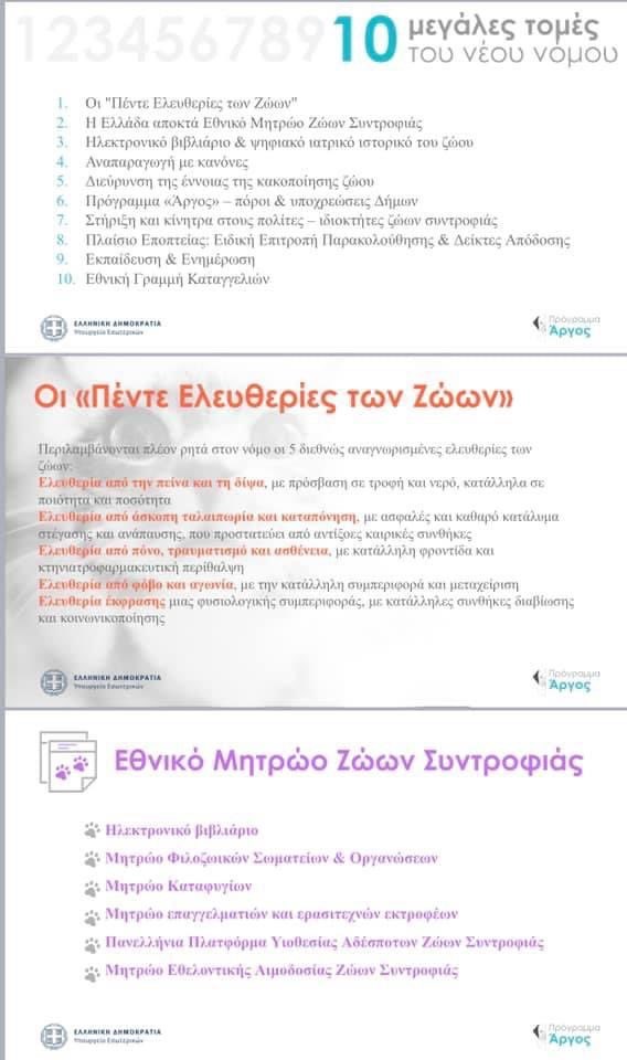 Θυμίζει τις πρόσφατες δεσμεύσεις του τ. Υπουργού Αγροτικής Ανάπτυξης και Τροφίμων και νυν υπουργού Εσωτερικών, Μάκη Βορίδη ότι το σχέδιο νόμου αποτελεί νομοθετική πρωτοβουλία του ΥΠΑΑΤ και τονίζει ότι πάρα τις αντιδράσεις όλων των αρμόδιων και επιστημονικών φορέων σχετικά με την μεταφορά αρμοδιοτήτων διαχείρισης των ζώων συντροφιάς, «μεθοδεύεται πλέον με θεσμική εκτροπή η αναίσχυντη διάλυση του πλαισίου προστασίας των ζώων συντροφιάς», με κύρια σημεία: