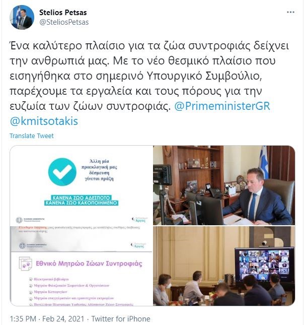 «Το πλέον θλιβερό είναι ότι οι παραπάνω μεθοδεύσεις φέρεται πως έχουν την υπογραφή του αξιότιμου κ. Πρωθυπουργού, κάτι το οποίο, αν ισχύει, σημαίνει ότι ο ίδιος αντιλαμβάνεται την προστασία των ζώων συντροφιάς ως μια ακόμα επιχειρηματική αγορά η οποία πρέπει να ελευθερωθεί για να μπορεί ο κάθε επιτήδειος, νόμιμα πλέον, να εμπορεύεται άτυχα και δυστυχή πλάσματα, φορώντας απλά τον φερετζέ του «φιλόζωου», με διόλου ευκαταφρόνητα ποσά να διακινούνται, αθρόα και αφορολόγητα, καθώς αυτά με την σειρά τους φορούν τον φερετζέ της «φιλοζωικής δωρεάς», της «κάλυψης εξόδων» και άλλα λοιπά ευφάνταστα.
