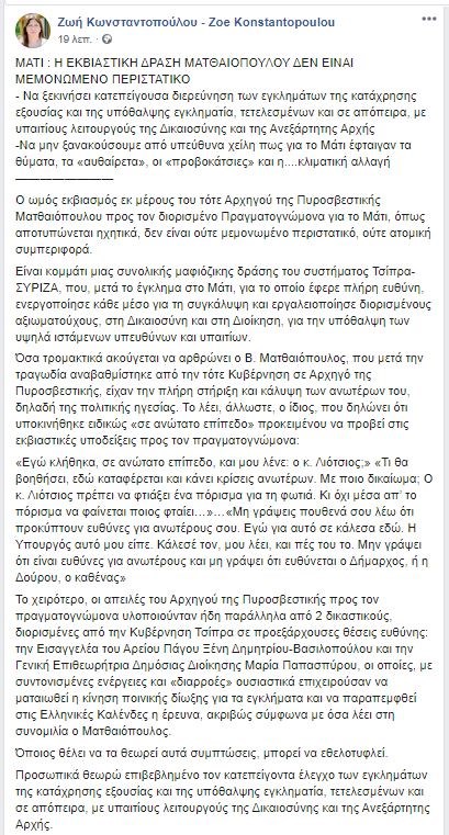 Σε ανάρτησή της στο facebook η επικεφαλής της Πλεύσης Ελευθερίας Ζωή Κωνσταντοπούλου αναφέρεται και πάλι στη φονική πυρκαγιά στο Μάτι, παραμονή της επετείου της τραγωδίας και ζητεί “να ξεκινήσει κατεπείγουσα διερεύνηση των εγκλημάτων της κατάχρησης εξουσίας και της υπόθαλψης εγκληματία, τετελεσμένων και σε απόπειρα, με υπαιτίους λειτουργούς της Δικαιοσύνης και της Ανεξάρτητης Αρχής” ενώ παράλληλα επισημαίνει “να μην ξανακούσουμε από υπεύθυνα χείλη πως για το Μάτι έφταιγαν τα θύματα, τα «αυθαίρετα», οι «προβοκάτσιες» και η… κλιματική αλλαγή”.