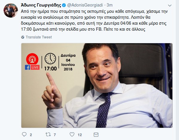 Ο κ. Γεωργιάδης θα κάνει live εκπομπές, στις οποίες θα σχολιάζει σε πρώτο χρόνο, όπως τουλάχιστον αναφέρει στο tweet του, την επικαιρότητα.