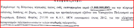 Τα δημόσια ταμεία φτωχαίνουν κατά 1 εκατ. ευρώ, ενώ τα ταμεία του ΟΤΕ γίνονται πλουσιότερα, αφού εισπράττουν αυτό το ποσό.Μεσολαβητής αυτής της οικονομικής σχέσης είναι το υπουργείο Πολιτισμού, το οποίο στις 3 Ιανουαρίου 2012, αποφάσισε, μέσω του τμήματος προμηθειών και εκκαθάρισης δαπανών, να εγκρίνει το ποσό του 1.000.000 ευρώ, προκειμένου να εξοφλήσει παλιές αμαρτίες.Δηλαδή λογαριασμούς σταθερής τηλεφωνίας….