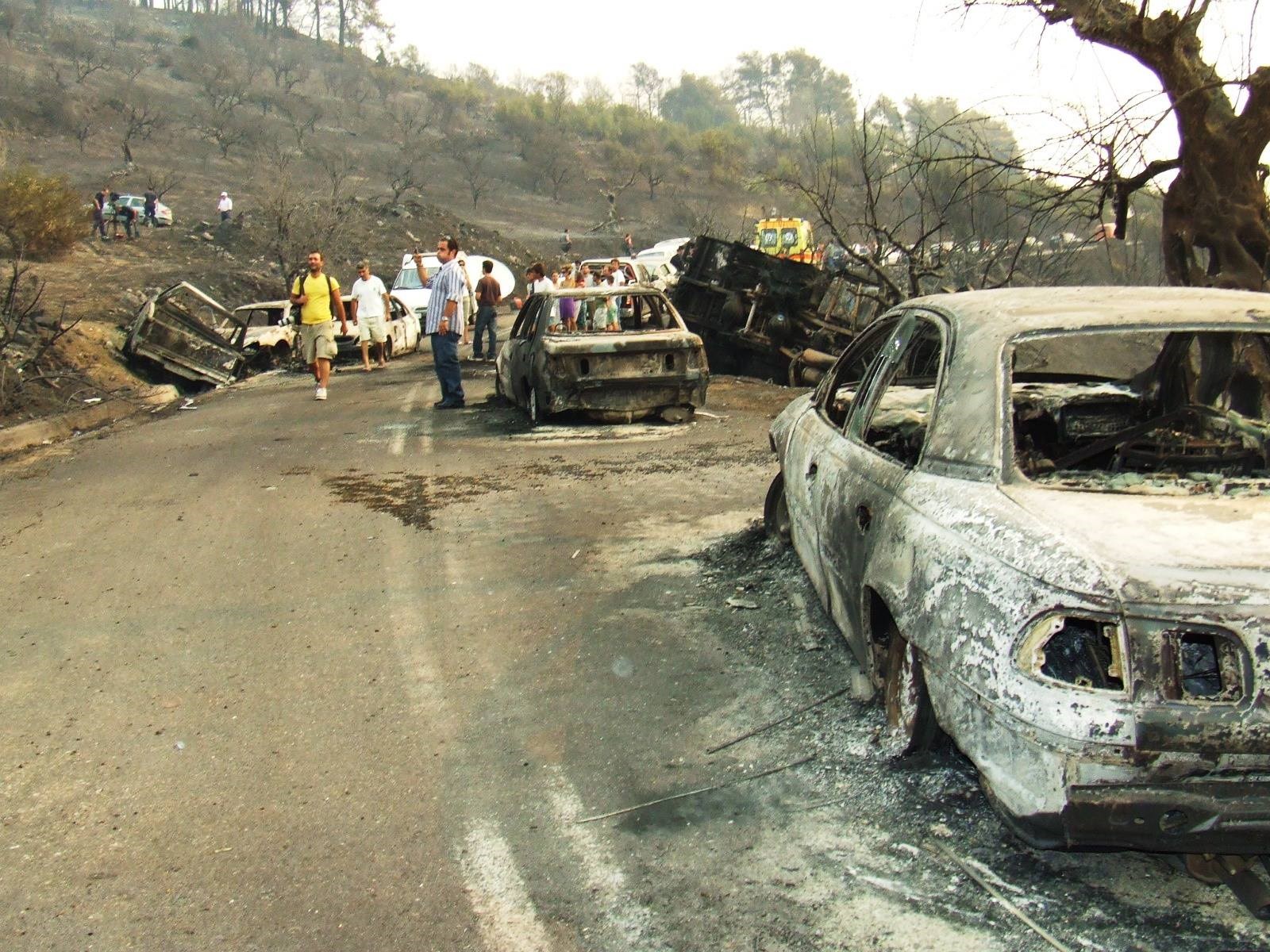 15.20-15.30. Καυτός αέρας χτυπάει με ορμή τα σταθμευμένα αυτοκίνητα. Ο Σπύρος Κιόσια αφήνει το μηχανάκι και πεζός κατευθύνεται προς τους πυροσβέστες. Είναι άσπροι σαν το πανί και παγωμένοι. Βουτάει τη γιαγιά με τα παιδιά και τους λέει να τρέξουν προς την πλαγιά. Η φωτιά έρχεται από παντού. Ακούγονται δυνατές εκρήξεις. Τα παιδιά ουρλιάζουν. Η φωτιά έρχεται από όλες τις κατευθύνσεις. Το αυτοκίνητο του δημάρχου Πανταζή Χρονόπουλου παίρνει φωτιά. Δήμαρχος και αντιδήμαρχος βγαίνουν από το αυτοκίνητο και αρχίζουν να τρέχουν. Ο αντιδήμαρχος Σπύρος Μπηλιώνης δεν μπορεί να αναπνεύσει. Πυκνός καπνός σκοτεινιάζει τα πάντα. Παρόλα αυτά διακρίνει τον δήμαρχο που τρέχει. Ο δήμαρχος μπαίνει στο τζιπ. Ο αντιδήμαρχος Κρέσπης φεύγει πεζός προς την πλαγιά. Το τζιπ με τον δήμαρχο κατευθύνεται προς την πλαγιά με σκοπό να ξαναβγεί στην άσφαλτο από την άλλη πλευρά του λόφου. Διασχίζει τη φωτιά. Δήμαρχος και αντιδήμαρχος προσεύχονται στον Αγιο Σπυρίδωνα. Ο αντιδήμαρχος Μπηλιώνης είναι σίγουρος ότι για να σωθεί κανείς, πρέπει να πάει κόντρα στην φωτιά. «Και αν ανατιναχτεί το ντεπόζιτο;» σκέφτεται. Τα καταφέρνουν. Οδηγούν πάνω σε καμένη γη. Τα λάστιχα του τζιπ έχουν σχεδόν λιώσει. Παίρνουν τον δρόμο για τη Μάκιστο. Ο αντιδήμαρχος Αντώνης Κρέσπης τρέχει να σωθεί με πορεία προς τα χωράφια. Στον λόφο συναντάει τον Σπύρο Κιόσια. Είναι μαζί τους και ένας τρίτος άνδρας. Σκάβουν με τα χέρια τους το χώμα. Ο Σπύρος πετάει το κινητό του τηλέφωνο για να μην «ανατιναχτεί». Ο αντιδήμαρχος κρατάει το κινητό του στην τσέπη του. Ο τρίτος άνδρας καίγεται δίπλα τους. Σκεπάζουν τα πρόσωπά τους με χώμα. Η λάβα περνάει από πάνω τους. Όλα τα καλά και τα κακά που έκανε σε αυτή την ζωή περνούν μπρο- στά από τα μάτια του Σπύρου. Δευτερόλεπτα. Περνάει από πάνω τους και ίσα που τους χαϊδεύει. Όλα καίγονται γύρω. Δεκατέσσερις άνθρωποι απανθρακώνονται.