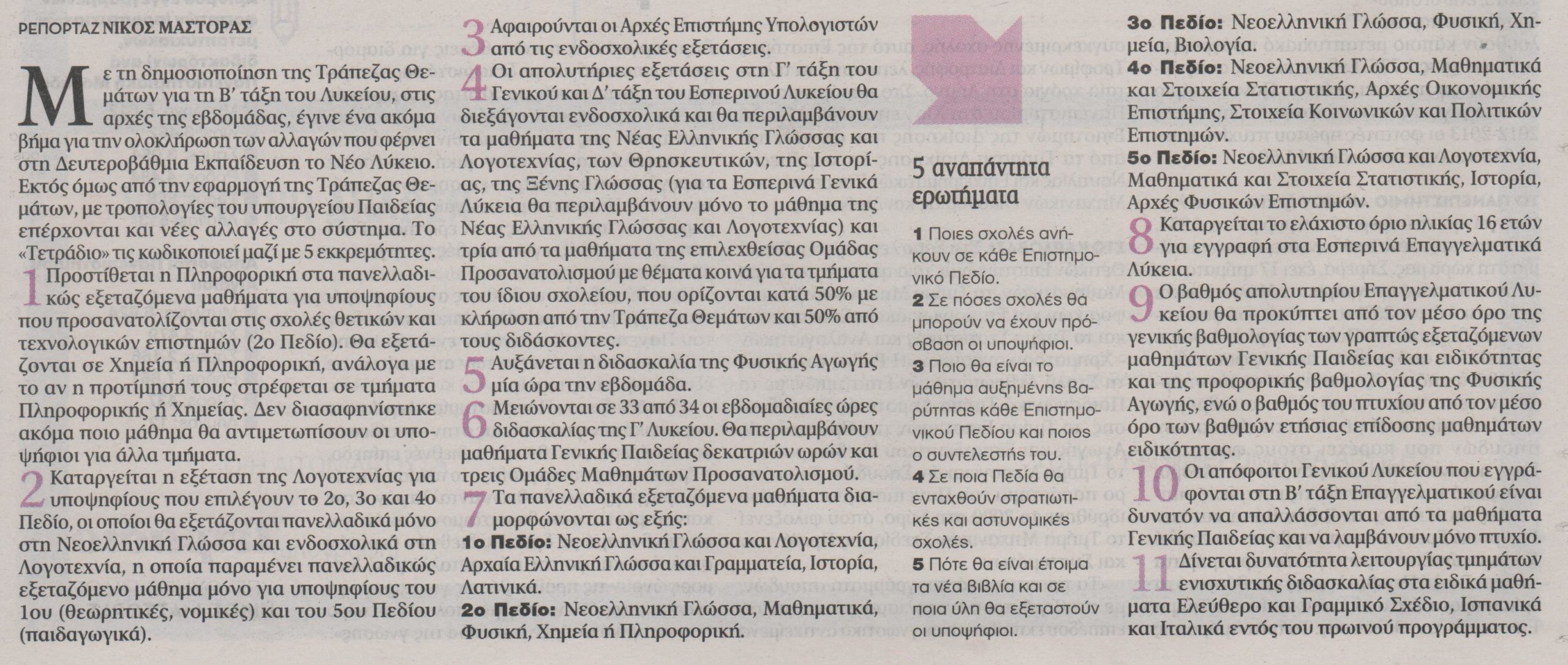 Με τη δημοσιοποίηση της Τράπεζας Θεμάτων για τη Β’ τάξη του Λυκείου, στις αρχές της εβδομάδας, έγινε ένα ακόμα βήμα για την ολοκλήρωση των αλλαγών που φέρνει στη δευτεροβάθμια εκπαίδευση τα Νέο Λύκειο. Εκτός όμως από την εφαρμογή της Τράπεζας Θεμάτων, με τροπολογίες του υπουργείου Παιδείας επέρχονται και νέες αλλαγές στο σύστημα.