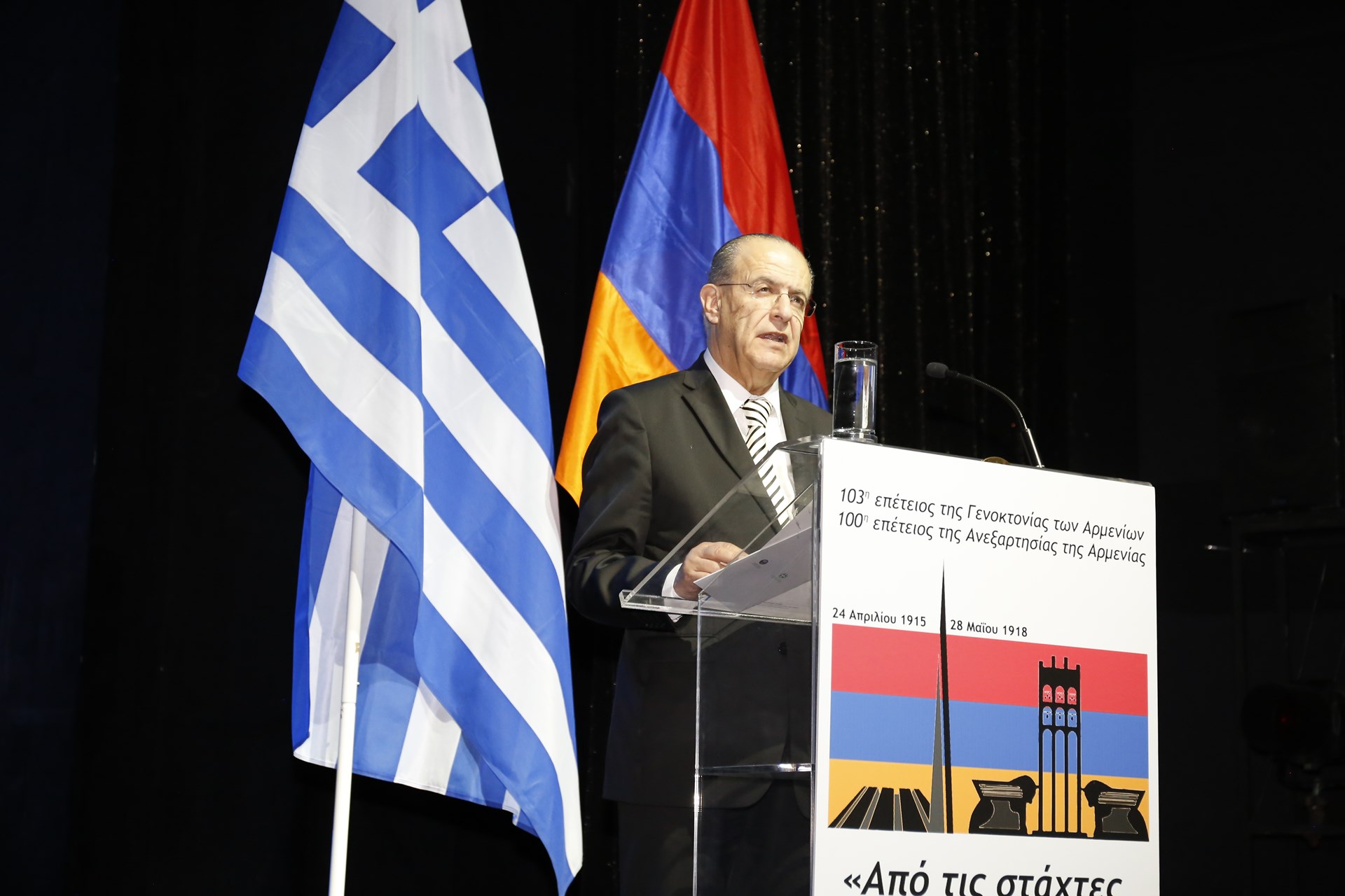 Εκ μέρους της Αρμενικής Νεολαίας Ελλάδος χαιρετισμό απηύθυνε ο κ. Βαζκέν Σαβουλιάν, ο οποίος σημείωσε «…Με τη συμπλήρωση των 103 χρόνων από τη Γενοκτονία συνεχίζουμε να διεκδικούμε από την Τουρκία των σουλτάνων, των Γκρίζων λύκων. Την Τουρκία που μέχρι και σήμερα συνεχίζει τις θηριωδίες και τον επεκτατισμό της, εκμεταλεύεται τη γεωπολιτική της θέση, καταστρατηγεί τα ανθρώπινα δικαιώματα, στραγγαλίζει τις λαϊκές ελευθερίες, φυλακίζει δημοσιογράφους, κατατρέχει εκλεγμένους βουλευτές, ποδοπατά το διεθνές δίκαιο, αδιαφορεί για τον ευρωπαϊκό χάρτη, κατέχοντας παράνομα το βόρειο τμήμα της Κύπρου, προκαλεί συνεχώς σε Ανατολική Μεσόγειο και Αιγαίο, κρατά παράνομα τους δυο Έλληνες στρατιωτικούς στην Αδριανούπολη. Η χώρα αυτή δεν σέβεται τους δικούς της πολίτες. Πως περιμένουμε να σεβαστεί τους Έλληνες,τους Ασσύριους, τους Κούρδους, τους Αρμένιους;»