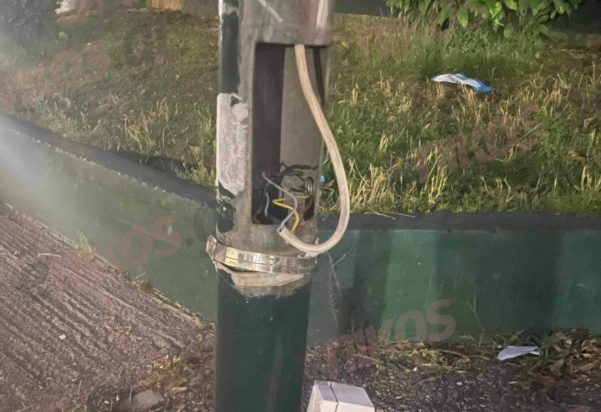 Όπως φαίνεται και στις φωτογραφίες που έστειλε ο αναγνώστης στο enikos.gr τα καλώδια, πράγματι, προεξέχουν από την κολώνα φωτισμού.