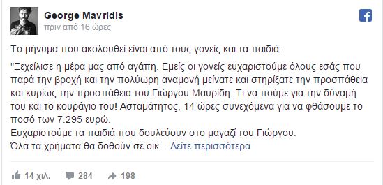 Μεγάλη ήταν η απήχηση του κόσμου στη συγκινητική πρωτοβουλία του Γιώργου Μαυρίδη, για οικογένειες που τα παιδιά τους πάσχουν από νεοπλασματικες ασθένειες και χρονιές παθήσεις, καθώς το ποσό που συγκεντρώθηκε ήταν 7.295 ευρώ.
