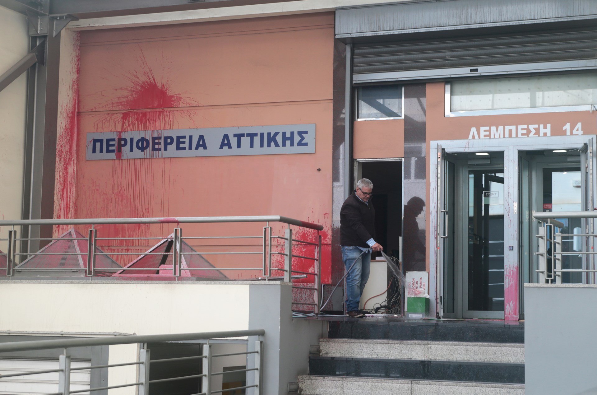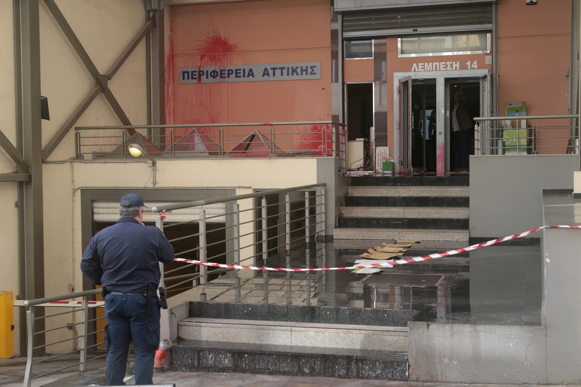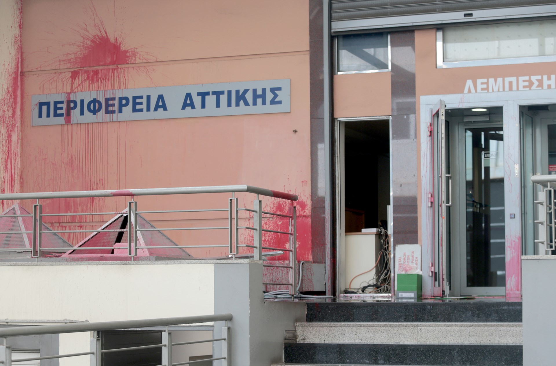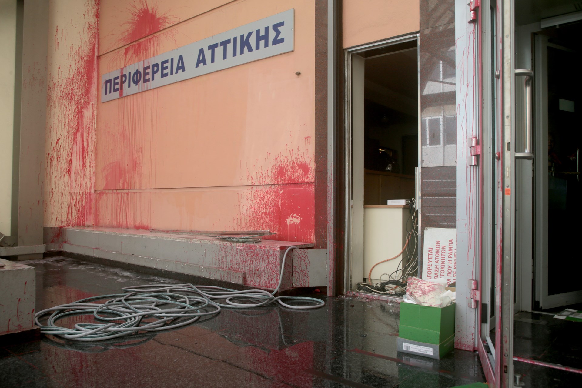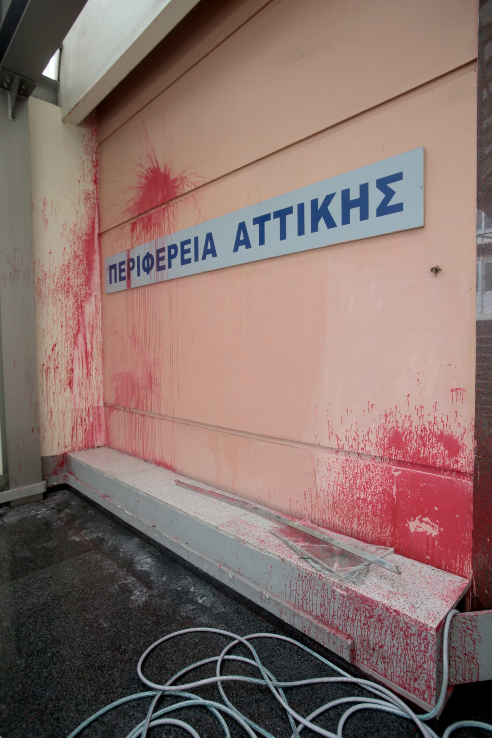 Φθορές στην είσοδο και το εσωτερικό της Περιφέρειας Αττικής προκάλεσαν το πρωί μέλη του Ρουβίκωνα, σπάζοντας τις τζαμαρίες και πετώντας μπογιές στο κτίριο.