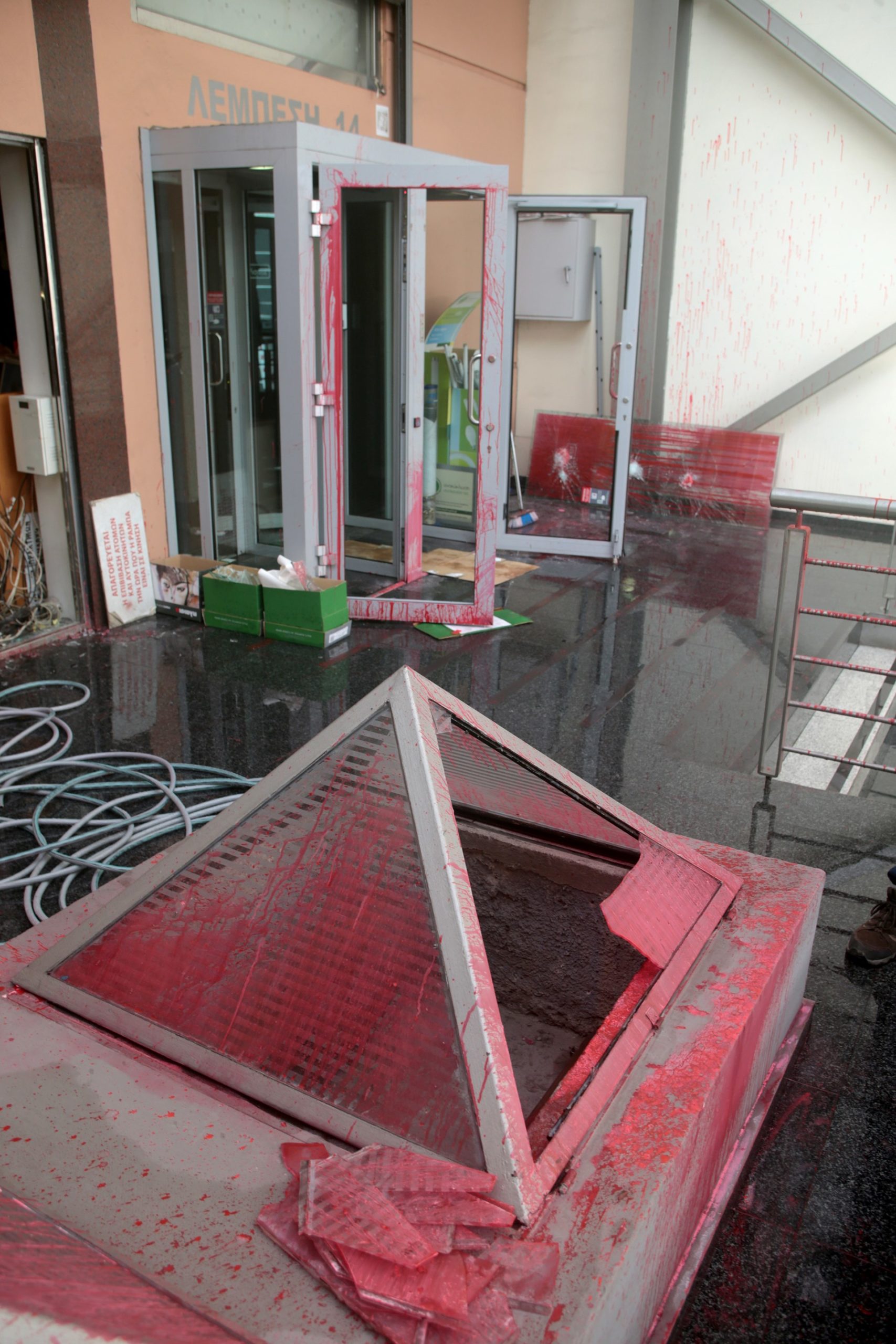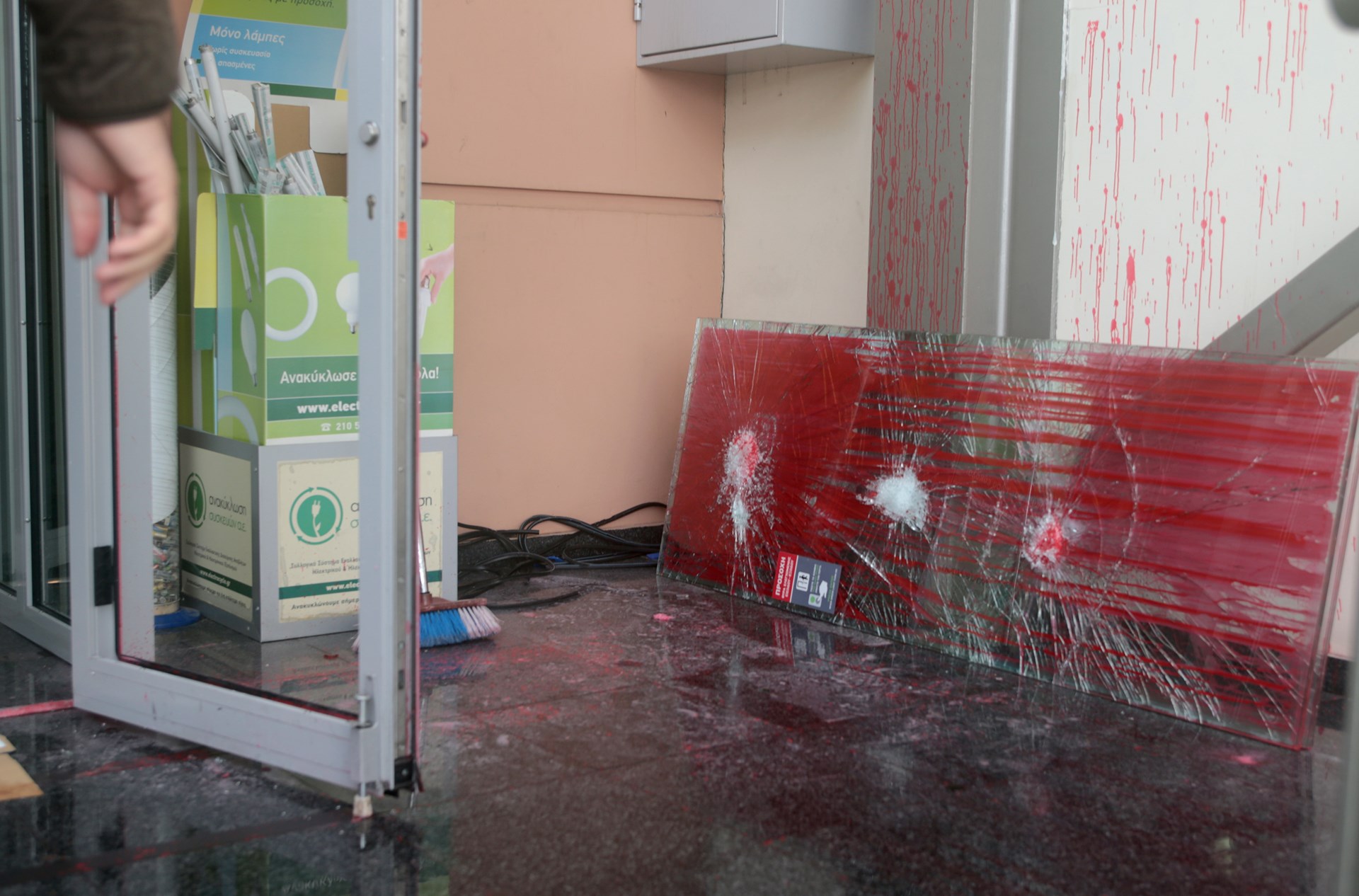 Προκάλεσαν φθορές με βαριοπούλες στην είσοδο του κτιρίου, από την οδό Λεμπέση, ενώ πέταξαν μπογιές και στη συνέχεια αποχώρησαν.