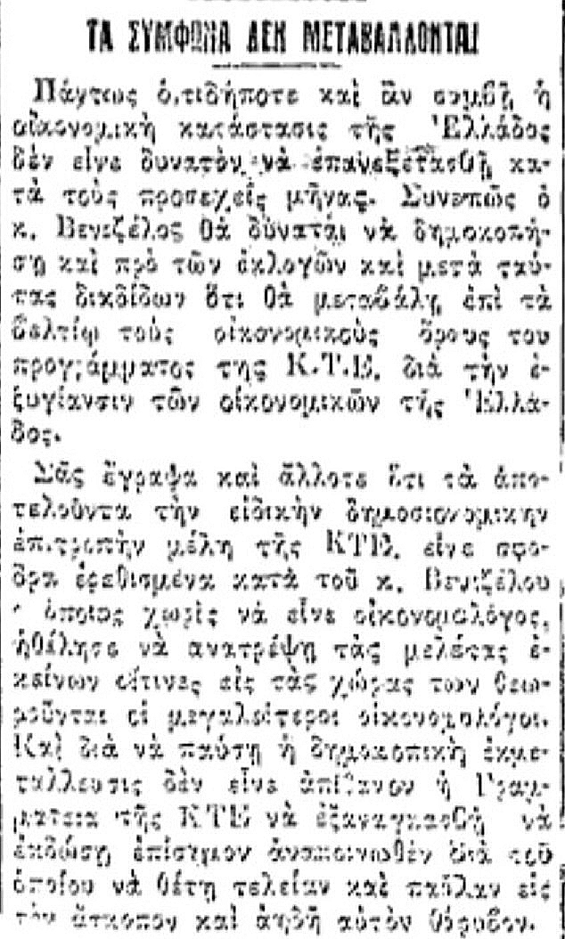 «Ο Καφαντάρης φοβάται πολύ την κοινήν γνώμην, ότι δεν θα του συγχωρήσει έναν συμβιβασμόν ο οποίος θα συνεπήγετο την πληρωμήν εκ μέρους μας προς την Γαλλίαν οιουδήποτε ποσού (…) Ιδίως όμως πρέπει να εννοήση, ότι η δημοκρατική κοινή γνώμη δεν θα του συγχωρήση ποτέ το ναυάγιον της οικονομικής εξυγιάνσεως και την εχθρότητα της Γαλλίας. Την φιλίαν της Γαλλίας ας την εξαγοράσωμεν επί τέλους. (…) Η προσφυγή εις τυχοδιωκτικούς συνδυασμούς, δάνεια σουηδικά κλπ., θα είναι εξευτελισμός πολιτικός, όστις δεν λύει το οικονομικόν ζήτημά μας, ούτε μας απαλλάσσει τουλάχιστον της πληρωμής προς την Γαλλίαν. (…) Θα χρειασθή συστηματική και επίμονος εργασία εκ μέρους σας, ώστε να αποφασίση το ταχύτερον τον συμβιβασμόν με πληρωμάς ετησίας, ευτελείς σχετικώς…»