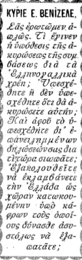 «Η τράπεζα εξέδωκε το χαρτονόμισμα -δεν το εξέδωκε το κράτος» απάντησε ο Ε. Βενιζέλος. Από κει και πέρα, «η Γαλλία είχε γίνει ο σημαιοφόρος της ιδέας της διαιτησίας, ώστε της ήτο ηθικώς αδύνατον να εκτεθή εις τον κίνδυνον τού να καταγγελθεί δημοσία ως αρνουμένη να παραδεχθή αυτήν».