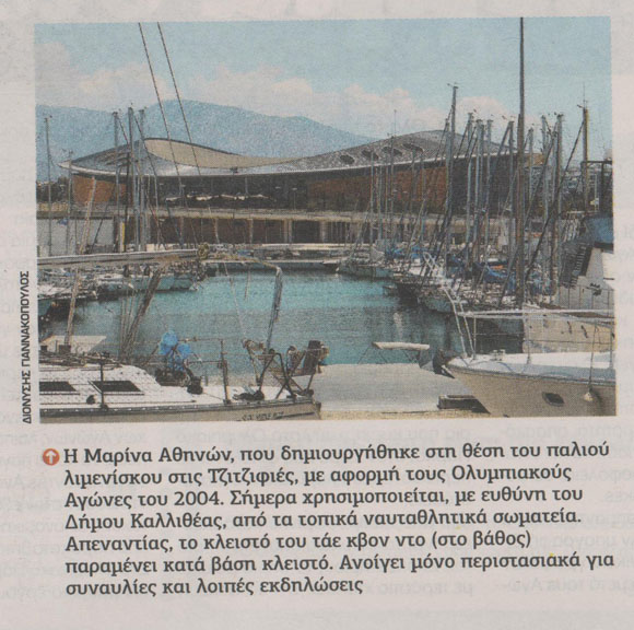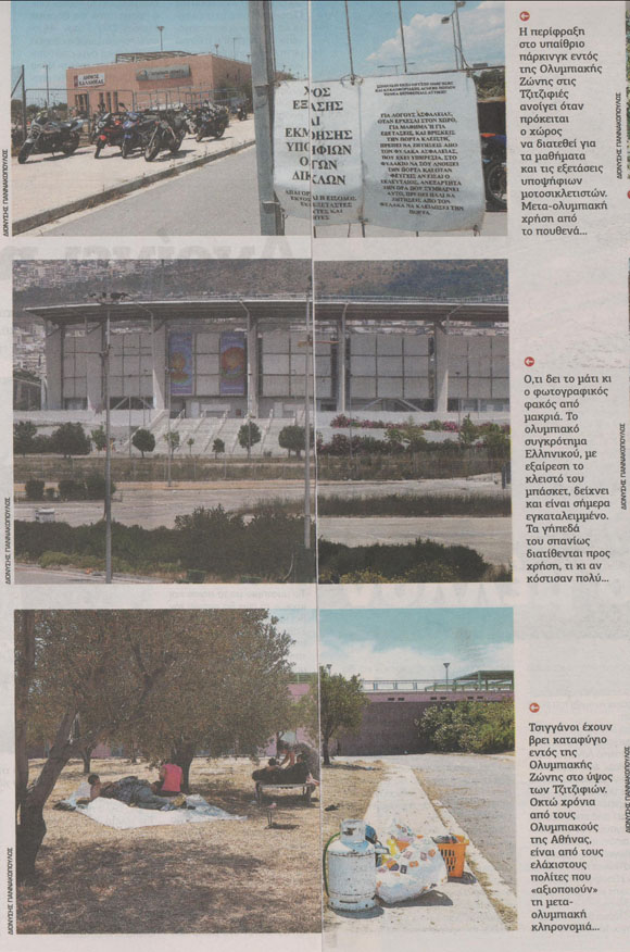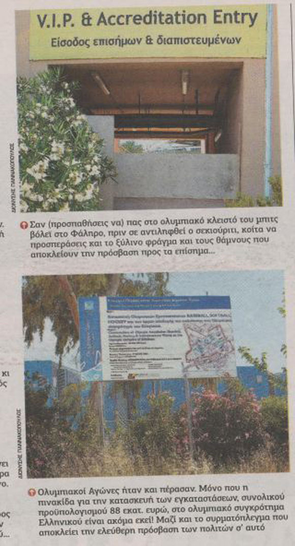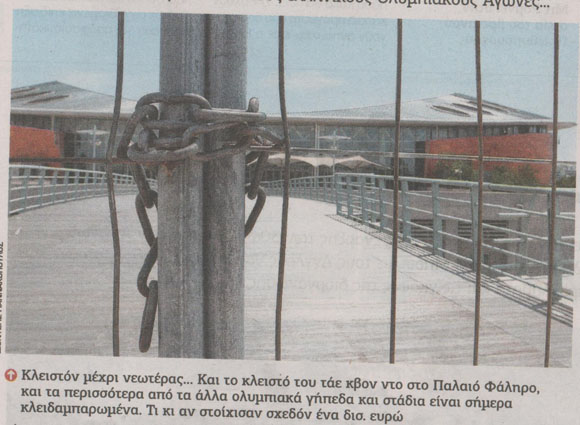 Το παράδειγμα του Σίδνεϊ και κυρίως της Βαρκελώνης που εκμεταλλεύτηκαν στο έπακρο την ολυμπιακή κληρονομιά τους, στην Ελλάδα δεν ακολουθήθηκε στο ελάχιστο.Μια απλή επίσκεψη σε ένα απο τα ολυμπιακά συγκροτήματα είναι ενδεικτική. Στο Φάληρο, ο φύλακας του γηπέδου του beach volley απλά απαγορεύει οποιαδήποτε πρόσβαση σε αυτό που κάποτε κόστισε 36 εκατομμύρια ευρώ.Κλειστόν μέχρι νεωτέρας και το γήπεδο του Τάε Κβον Ντο στο Παλαιό Φάληρο (που ανοίγει κατ’ εξαίρεση για να φιλοξενήσει συναυλίες), το ολυμπιακό συγκρότημα Ελληνικού (με εξαίρεση το κλειστό του μπάσκετ) είναι έρημα.