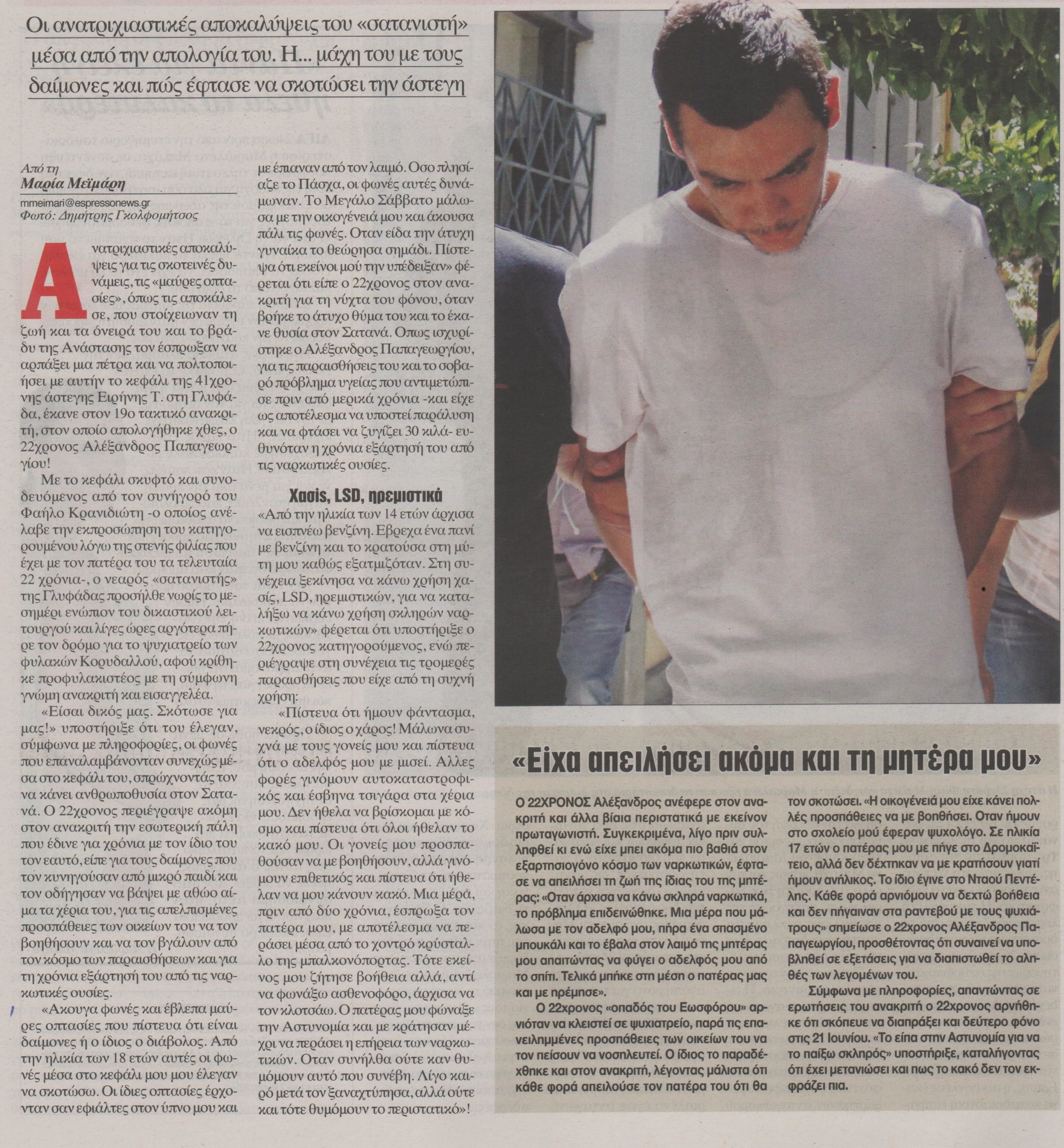 «Άκουγα φωνές και έβλεπα μαύρες οπτασίες που πίστευα ότι είναι δαίμονες ή ο ίδιος ο διάβολος. Από την ηλικία των 18 ετών αυτές οι φωνές μέσα στο κεφάλι μου μου έλεγαν να σκοτώσω. Οι ίδιες οπτασίες έρχονταν σαν εφιάλτες στον ύπνο μου και με έπιαναν από τον λαιμό. Όσο πλησίαζε το Πάσχα, οι φωνές αυτές δυνάμωναν. Το Μεγάλο Σάββατο μάλωσα με την οικογένειά μου και άκουσα πάλι τις φωνές. Όταν είδα την άτυχη γυναίκα το θεώρησα σημάδι. Πίστεψα ότι εκείνοι μού την υπέδειξαν» φέρεται να είπε ο 22χρονος στον ανακριτή για τη νύχτα του φόνου, όταν βρήκε το άτυχο θύμα του και το θυσίασε στον Σατανά. Όπως ισχυρίστηκε ο Αλέξανδρος Παπαγεωργίου, για τις παραισθήσεις του και το σοβαρό πρόβλημα υγείας που αντιμετώπισε πριν από μερικά χρόνια –και είχε ως αποτέλεσμα να υποστεί παράλυση και να φτάσει να ζυγίζει 30 κιλά- ευθυνόταν η χρόνια εξάρτησή του από τις ναρκωτικές ουσίες.