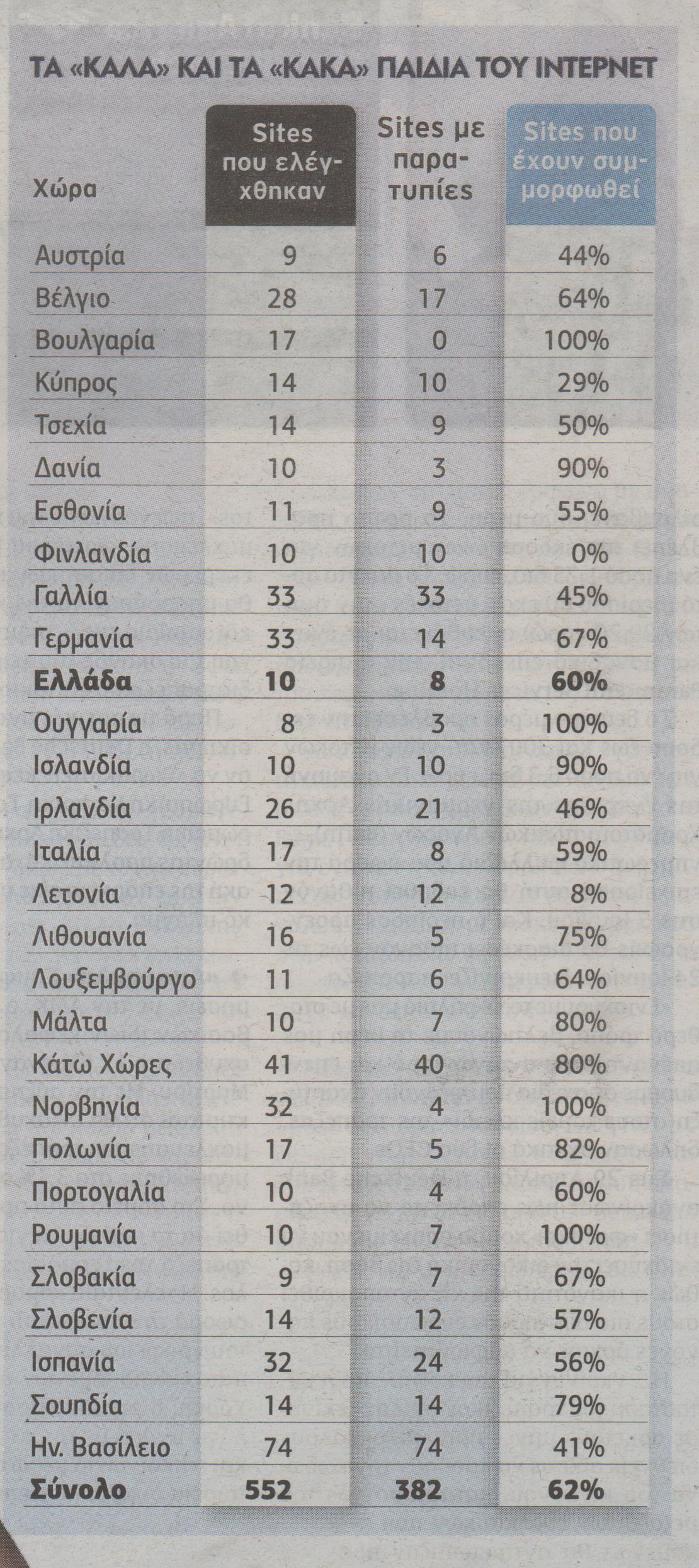 Έτσι, λοιπόν, σύμφωνα με όσα έγιναν γνωστά από την Ευρωπαϊκή Επιτροπή, διαπιστώθηκε ότι οι 382 από τους 552 δικτυακούς τόπους που ελέγχθηκαν το 2013 δεν τηρούσαν το ευρωπαϊκό καταναλωτικό δίκαιο. Δηλαδή περίπου το 69% είχε παρανομίες, όπως αναφέρει δημοσίευμα του Έθνους της Κυριακής.