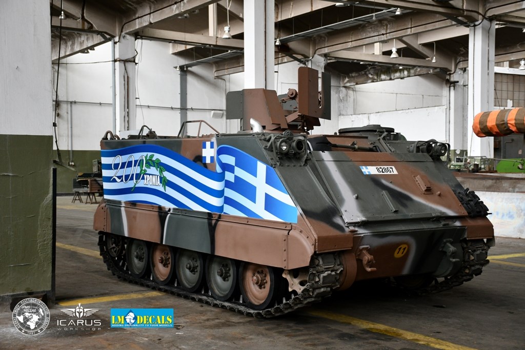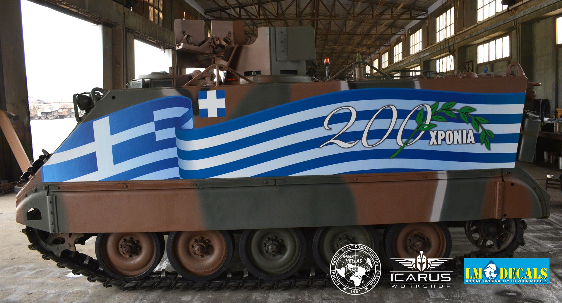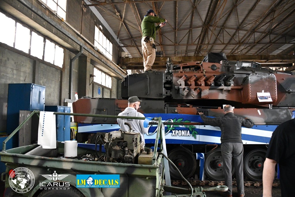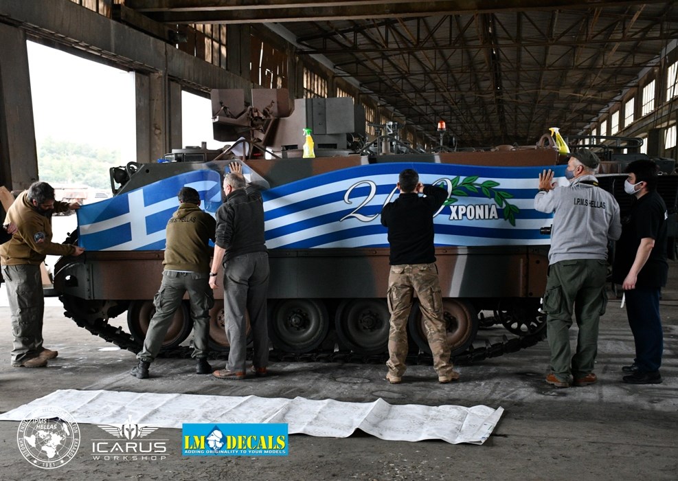 Η ετοιμασία των ειδικών εκδόσεων των τεθωρακισμένων οχημάτων για τα 200 χρόνια ξεκίνησε πριν από έναν μήνα από τους χομπίστες της IMPS Ελλάδος, όπως και τους επαγγελματίες των εταιριών Icarus Workshop του Δημήτρη Σταθόπουλου, ο οποίος υλοποίησε σχεδιαστικά το πρότζεκτ, και LM Decals που κατασκεύασαν και τοποθέτησαν τον επετειακό διάκοσμο πάνω στα οχήματα. «Το βασικό σχέδιο προτάθηκε από το ΓΕΣ, εμείς εκτελέσαμε τις τροποποιήσεις, την ειδική προσαρμογή και την τοποθέτηση πάνω στα δύο ερπυστριοφόρα οχήματα. Είναι μια πολύ απαιτητική και ιδιότυπη εργασία να “ τοποθετήσεις” έναν διάκοσμο πάνω σε ένα άρμα δέκα μέτρων και… 70 τόνων!», επισήμανε ο κ. Σούλης.
