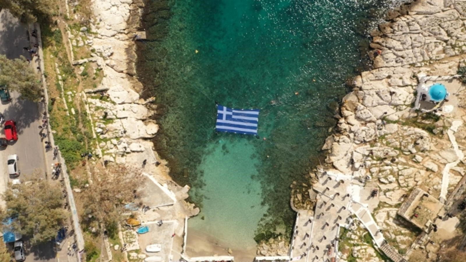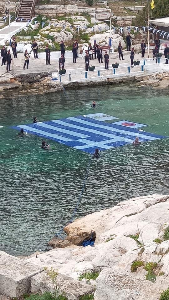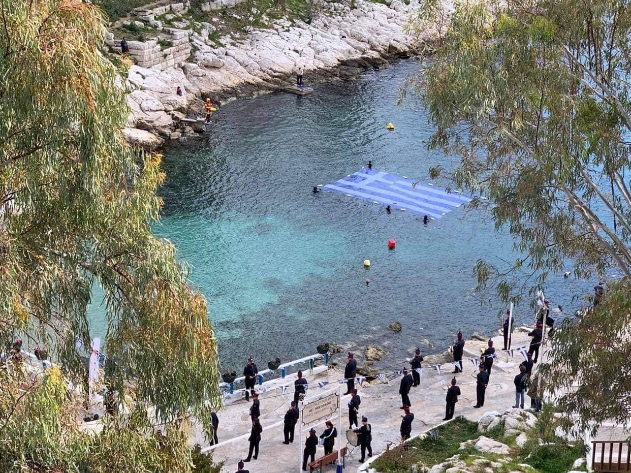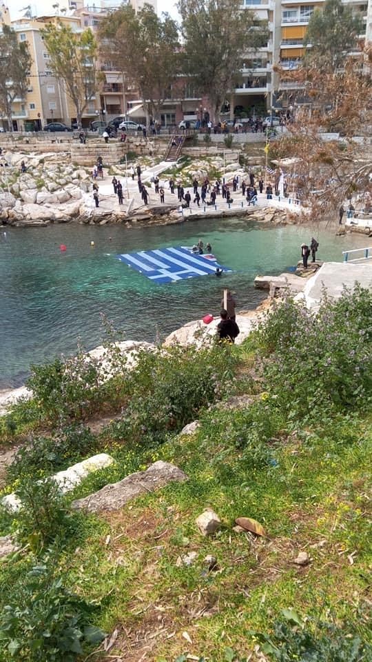 Η γαλανόλευκη σημαία απλώθηκε πάνω στο νερό και δέθηκε με σκοινιά στα βράχια, με τη φιλαρμονική του Δήμου Πειραιά να παιανίζει τον Εθνικό Ύμνο κατά την «έπαρση» της σημαίας στον όμορφο κολπίσκο της Πειραϊκής.