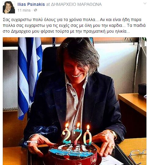 Ο Δήμαρχος Μαραθώνα ανέβασε την τούρτα στο λογαριασμό του στο facebook και με το γνωστό του χιούμορ σχολίασε ότι αυτή είναι η πραγματική του ηλικία.