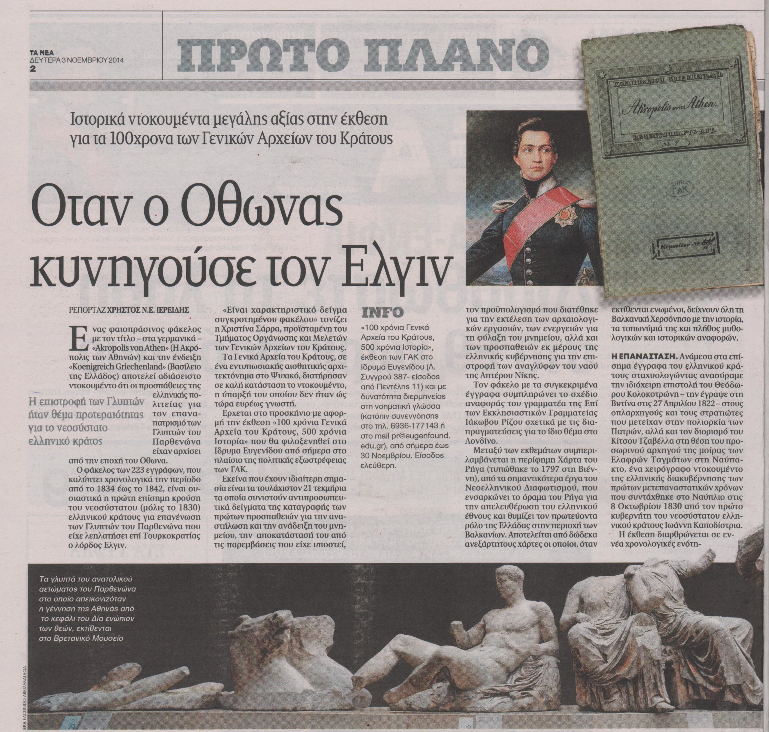Ένας φαιοπράσινος φάκελος με τον τίτλο –στα γερμανικά- «Akropolis von Athen» (Η Ακρόπολη των Αθηνών) και την ένδειξη «Koenigreich Griechenland» (Βασίλειο της Ελλάδος) αποτελεί αδιάσειστο ντοκουμέντο ότι οι προσπάθειες της ελληνικής πολιτείας για τον επαναπατρισμό των Γλυπτών του Παρθενώνα είχαν αρχίσει από την εποχή του Όθωνα.