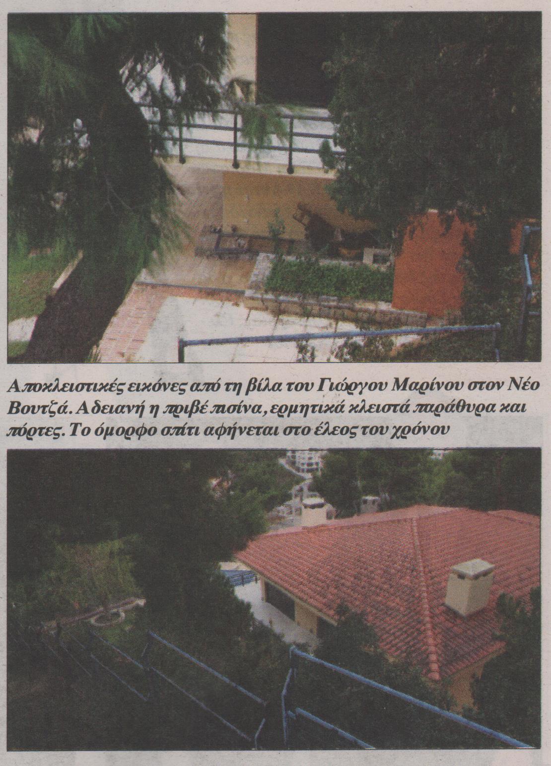 «Ο Μαρίνος είχε από παλιά ένα διαμέρισμα στην περιοχή των Αμπελοκήπων το οποίο χρησιμοποιούσε κατά καιρούς για να ξεκουράζεται, όταν δεν επιθυμούσε να μένει στη βίλα του στον Νέο Βουτζά, που απέχει αρκετά χιλιόμετρα από την Αθήνα. Ωστόσο δεν μπορεί κανείς να πει με βεβαιότητα ότι σήμερα ζει σε αυτό το διαμέρισμα, γιατί λέγεται πως φέτος βρισκόταν σε συνεννοήσεις να το πουλήσει κι αυτό, όπως και τη βίλα του και μάλιστα σε τιμή ευκαιρίας».
