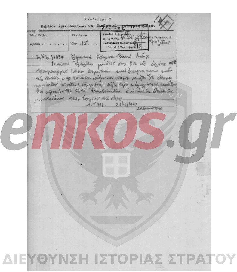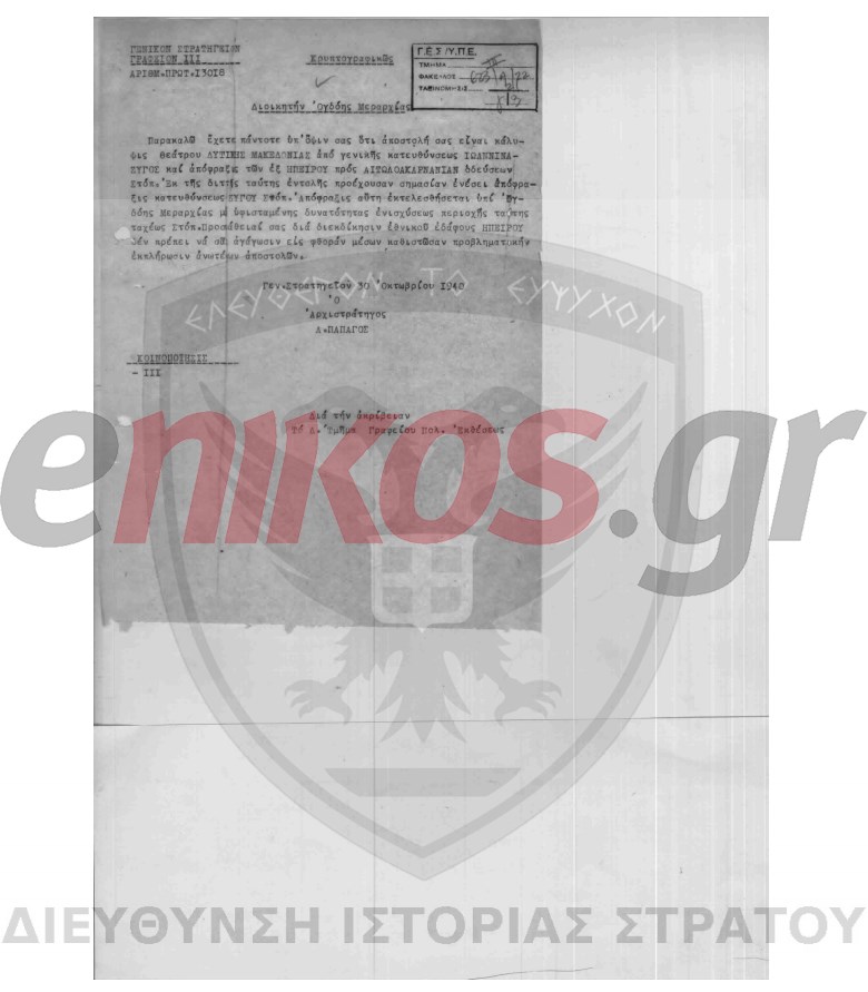 Σύμφωνα με την διαταγή που φέρνει στην δημοσιότητα σήμερα ο enikos.gr, η εντολή είναι να στήσουν γραμμή άμυνας αντιμετώπισης των Ιταλών στον Ζυγό. Πρόκειται για περιοχή κοντά στο Μέτσοβο.