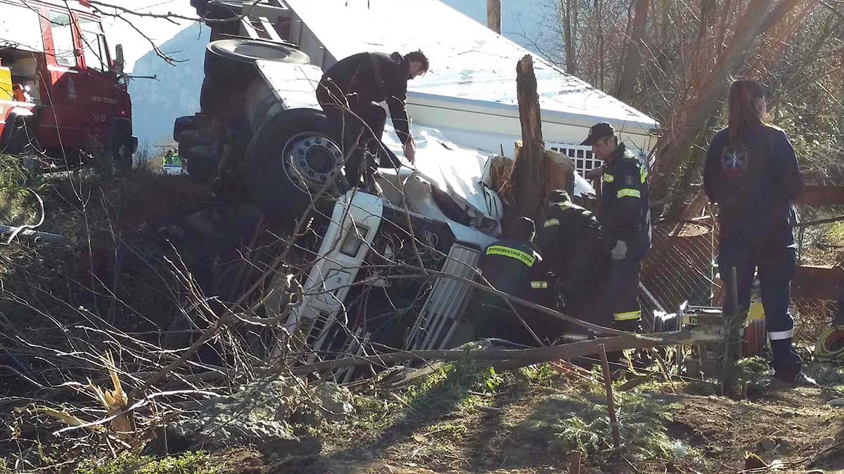 Σοβαρά τραυματισμένος είναι ο οδηγός της νταλίκας με τους διασώστες να μην μπορούν να τον προσεγγίσουν για να του παράσχουν τις πρώτες βοήθειες.