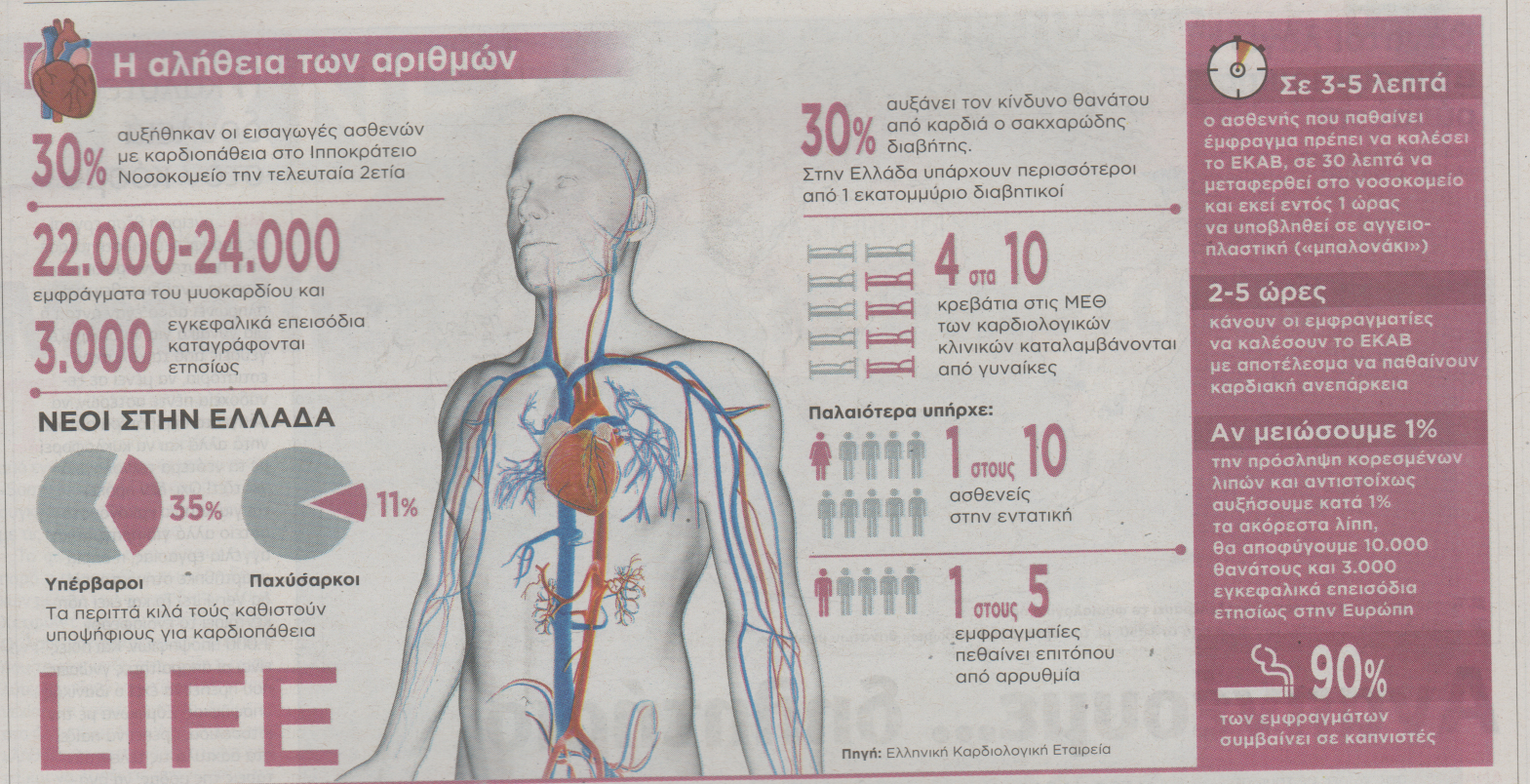 Όπως επισημαίνει ο Ιωάννης Καλλικάζαρος, πρόεδρος της ελληνικής καρδιολογικής εταιρείας (ΕΚΕ), την τελευταία διετία έχει αυξηθεί κατά 30% η εισαγωγή ανθρώπων που έχουν υποστεί έμφραγμα στο Ιπποκράτειο νοσοκομείο, ενώ οι καρδιοπάθειες πλήττουν πλέον εξίσου τις γυναίκες που μπήκαν δυναμικά στον επαγγελματικό στίβο, οπότε αγχώνονται, καπνίζουν και δεν ασκούνται, όπως οι άνδρες.