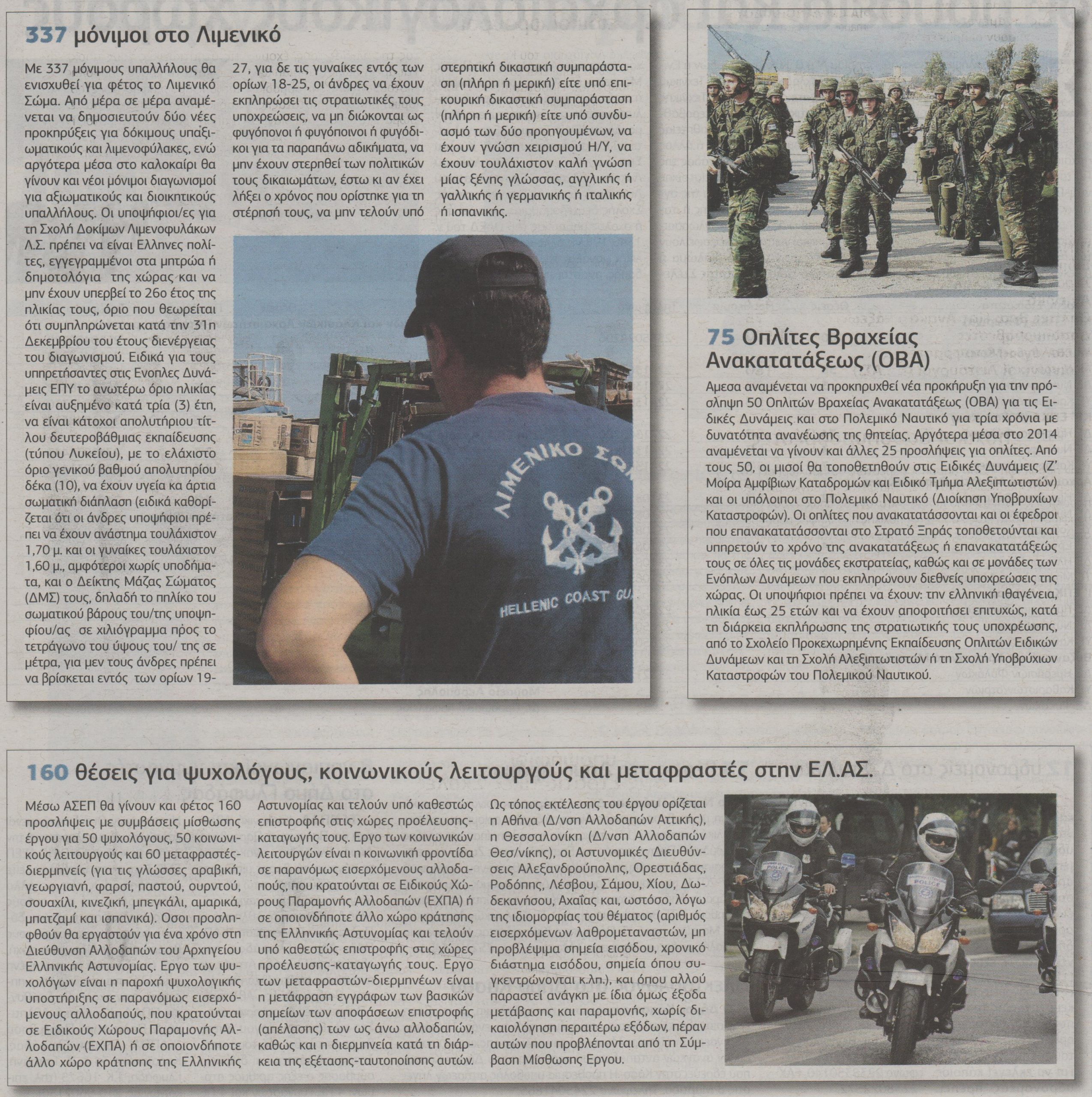 Θα ακολουθήσουν έπειτα οι 500 μόνιμοι ειδικοί φρουροί, 75 Οπλίτες Βραχείας Ανακατατάξεως με θητεία, 1.500 εποχικοί δασοπυροσβέστες και 160 ψυχολόγοι, μεταφραστές και κοινωνικοί λειτουργοί στην ΕΛ.ΑΣ. με συμβάσεις μίσθωσης έργου.