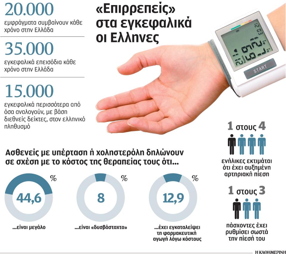 Ιδιαίτερα «επιρρεπείς» στα εγκεφαλικά επεισόδια είναι οι Ελληνες. Στη χώρα μας κάθε χρόνο συμβαίνουν 35.000 εγκεφαλικά επεισόδια έναντι 20.000 εμφραγμάτων, τη στιγμή που στις περισσότερες χώρες της Ευρώπης ο αριθμός των εγκεφαλικών είναι ίσος με αυτόν τον εμφραγμάτων.