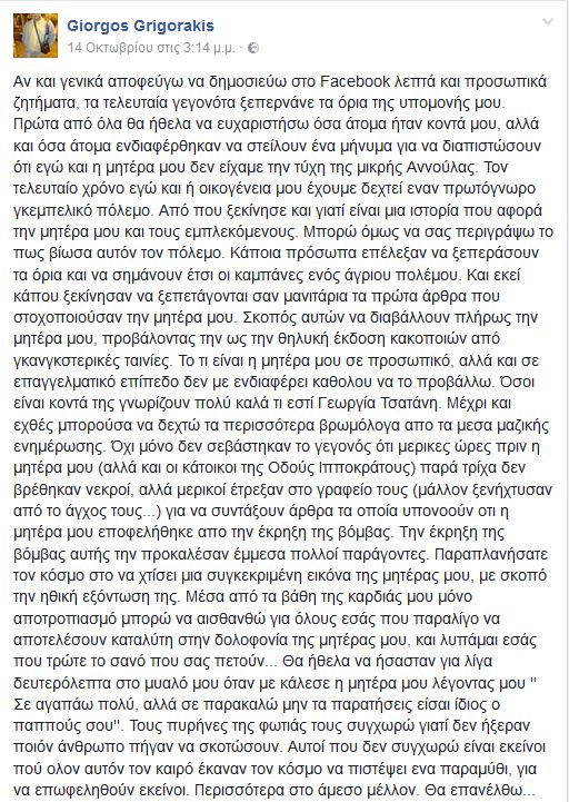 «Τον τελευταίο χρόνο εγώ και η οικογένεια μου έχουμε δεχτεί έναν πρωτόγνωρο γκεμπελικό πόλεμο. Από που ξεκίνησε και γιατί είναι μια ιστορία που αφορά την μητέρα μου και τους εμπλεκόμενους», αναφέρει μεταξύ άλλων στον προσωπικό του λογαριασμό στο Facebook, ο γιος της Εισαγγελέως, Γεωργίας Τσατάνη, Γιώργος Γρηγοράκης.