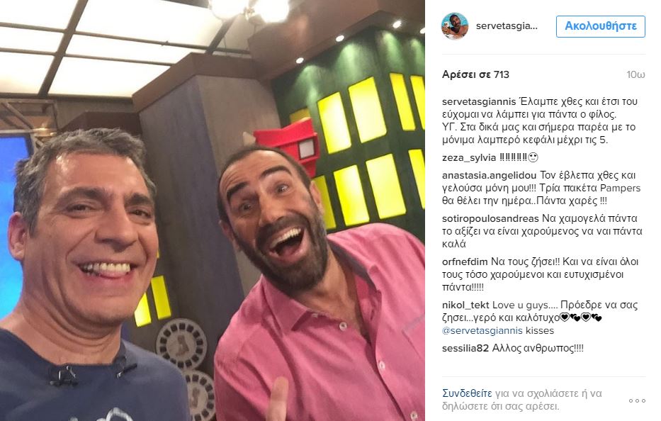 Σήμερα, μέσω του Instagram, ο στενός φίλος και συνεργάτης του Γιάννης Σερβετάς ευχήθηκε για άλλη μια φορά στον Αντώνη Κανάκη αναρτώντας μια φωτογραφία τους και γράφοντας το εξής: «Έλαμπε χθες και έτσι του εύχομαι να λάμπει για πάντα ο φίλος. ΥΓ. Στα δικά μας και σήμερα παρέα με το μόνιμα λαμπερό κεφάλι μέχρι τις 5».