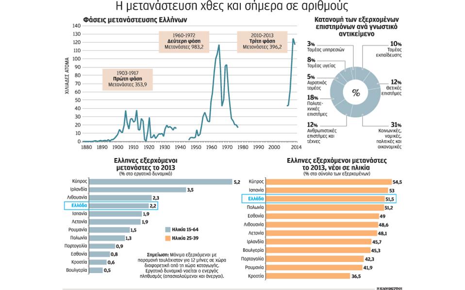 Ένα εκατομμύριο επτακόσιες εξήντα τέσσερις χιλιάδες άτομα είναι ο απολογισμός της μετανάστευσης των Ελλήνων στον 20ό και 21ο αιώνα. Ιστορικά και παραδοσιακά, η Ελλάδα συγκαταλέγεται στις χώρες με πλούσια εμπειρία αποδημίας. Η έκθεση της Τράπεζας της Ελλάδος με θέμα «Φυγή ανθρωπίνου κεφαλαίου: σύγχρονη τάση μετανάστευσης των Ελλήνων στα χρόνια της κρίσης», που δημοσιεύει η «Καθημερινή», αποκαλύπτει για πρώτη φορά τον αριθμό των Ελλήνων που εγκατέλειψαν τη χώρα εξαιτίας της κρίσης. Παράλληλα, γίνεται σύγκριση με τις προηγούμενες φάσεις μετανάστευσης, αναλύονται οι μακροοικονομικές συνέπειες και προτείνονται λύσεις για την αντιμετώπιση του φαινομένου.