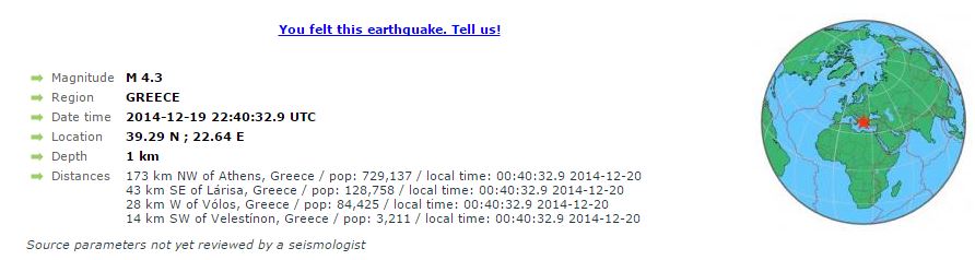 Σεισμική δόνηση εντάσεως 4,3 Ρίχτερ σημειώθηκε στο Βόλο στις 00:40, σύμφωνα με εκτίμηση του Ευρωμεσογειακού Ινστιτούτου.