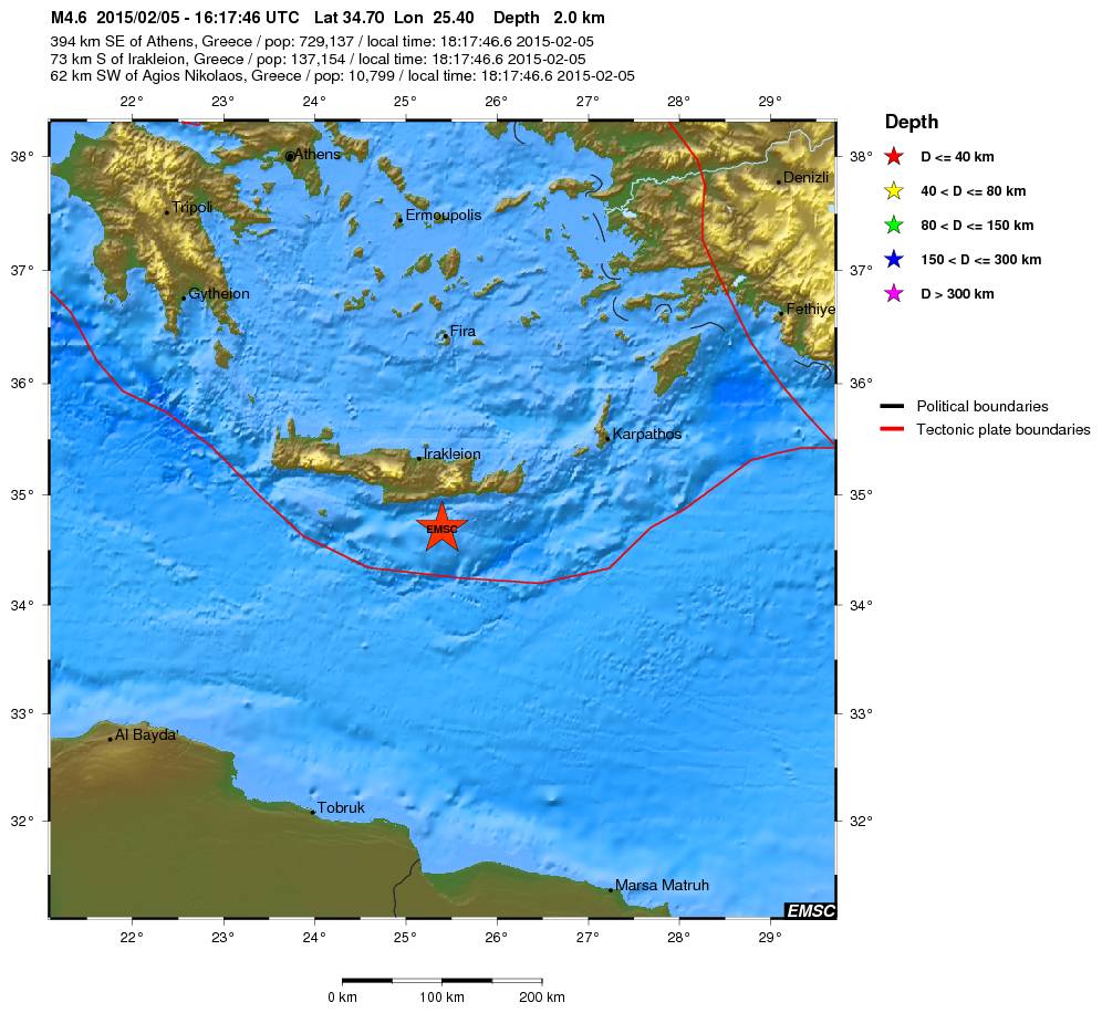 Σύμφωνα με το Ευρωμεσογειακό Σεισμολογικό Κέντρο, ο σεισμός που σημειώθηκε πριν από λίγο στην Κρήτη είχε μέγεθος 4,6 Ρίχτερ. Το επίκεντρο εντοπίζεται 62 χιλιόμετρα νοτιοδυτικά από τον Άγιο Νικόλαο και το εστιακό βάθος υπολογίζεται στα 2 χιλιόμετρα.