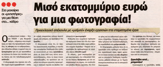 Μάλλον μας θεωρούν ακόμη «άγριους» και προσπαθούν να μας «κερδίσουν» με… χάντρες και καθρεφτάκια.Ενόψει της προεκλογικής περιόδου, η ηγεσία του υπουργείου Υποδομών έχει έρθει σε συνεννόηση με τους εργολάβους, ώστε σε έναν από τους πέντε αυτοκινητοδρόμους, όπου τα έργα έχουν εγκαταλειφθεί, να αρχίσουν για τα μάτια του κόσμου εργασίες, προκειμένου η πολιτική ηγεσία να βγάλει την… απαραίτητη φωτογραφία!Σύμφωνα με πληροφορίες της εφημερίδας «το Ποντίκι», η προεκλογική τελετή θα λάβει χώρα μάλλον στο κομμάτι Κορίνθου – Πατρών και οι εργολάβοι θα προχωρήσουν σε εργασίας ύψους 500.000 ευρώ.