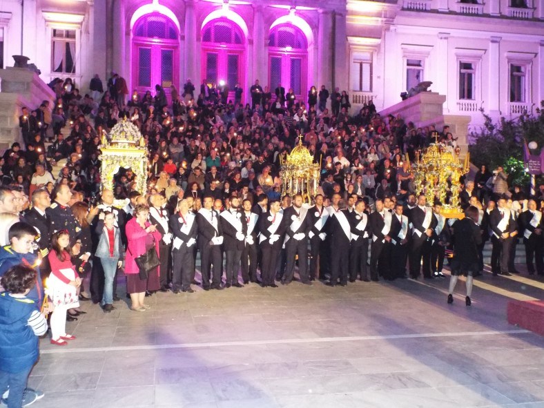 Χιλιάδες πιστοί, κάτοικοι και επισκέπτες του νησιού, κατέκλυσαν την πλατεία Μιαούλη και τους γύρω δρόμους για να παρακολουθήσουν την περιφορά των Επιταφίων των Ιερών Ναών Μεταμορφώσεως του Σωτήρος, Κοιμήσεως Θεοτόκου και Αγίου Νικολάου.