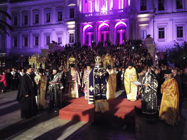 Σε κλίμα κατάνυξης, παρουσία πλήθους πιστών κορυφώθηκαν οι θρησκευτικές εκδηλώσεις της Μεγάλης Παρασκευής στη Σύρο με την Λιτανεία των Επιταφίων και την κοινή δέηση στην πλατεία Μιαούλη.