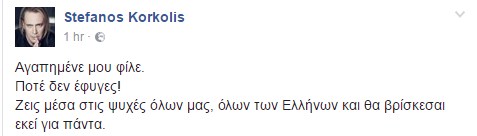 “Αγαπημένε μου φίλε. Ποτέ δεν έφυγες! Ζεις μέσα στις ψυχές όλων μας, όλων των Ελλήνων και θα βρίσκεσαι εκεί για πάντα”.