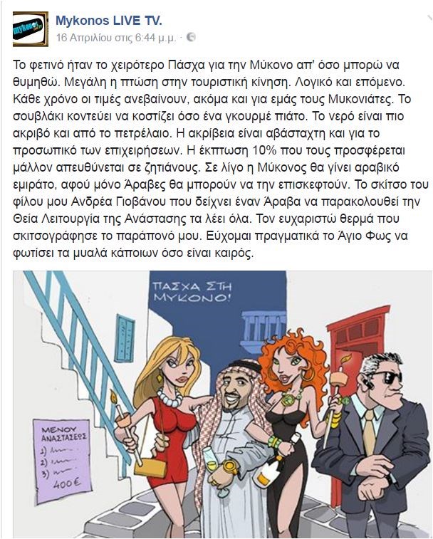 Τον γύρο του διαδικτύου κάνει ένα σκίτσο, το οποίο σχολιάζει με καυστικό τρόπο την ακρίβεια στο νησί της Μυκόνου. Το σκίτσο ανέβηκε στη σελίδα «Mykonos Live tv», στο facebook, και κάνει λόγο για… αραβικό εμιράτο, αφού όπως γράφεται «σε λίγο μόνο οι Άραβες θα μπορούν να επισκεφθούν το νησί».«Το φετινό ήταν το χειρότερο Πάσχα για την Μύκονο απ’ όσο μπορώ να θυμηθώ. Μεγάλη η πτώση στην τουριστική κίνηση. Λογικό και επόμενο. Κάθε χρόνο οι τιμές ανεβαίνουν, ακόμα και για εμάς τους Μυκονιάτες. Το σουβλάκι κοντεύει να κοστίζει όσο ένα γκουρμέ πιάτο. Το νερό είναι πιο ακριβό και από το πετρέλαιο. Η ακρίβεια είναι αβάσταχτη και για το προσωπικό των επιχειρήσεων. Η έκπτωση 10% που τους προσφέρεται μάλλον απευθύνεται σε ζητιάνους. Σε λίγο η Μύκονος θα γίνει αραβικό εμιράτο, αφού μόνο Άραβες θα μπορούν να την επισκεφτούν. Το σκίτσο του φίλου μου Ανδρέα Γιοβάνου που δείχνει έναν Άραβα να παρακολουθεί την Θεία Λειτουργία της Ανάστασης τα λέει όλα. Τον ευχαριστώ θερμά που σκιτσογράφησε το παράπονό μου. Εύχομαι πραγματικά το Άγιο Φως να φωτίσει τα μυαλά κάποιων όσο είναι καιρός», ήταν η λεζάντα που συνόδευε την ανάρτηση. Δείτε την ανάρτηση: