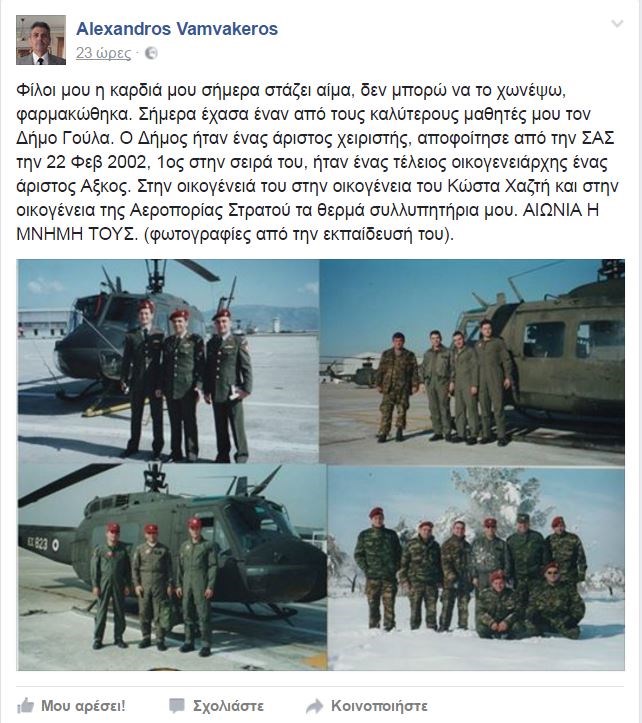 Συγκινημένος αποχαιρέτησε τον μαθητή του Δημοσθένη Γούλα, ο εκπαιδευτής του μέσω ανάρτησης στον προσωπικό του λογαριασμό στο Facebook.Μάλιστα, συνόδευσε το μήνυμά του με ένα κολάζ φωτογραφιών από την εκπαίδευσή του.«Φίλοι μου η καρδιά μου σήμερα στάζει αίμα, δεν μπορώ να το χωνέψω, φαρμακώθηκα. Σήμερα έχασα έναν από τους καλύτερους μαθητές μου τον Δήμο Γούλα. Ο Δήμος ήταν ένας άριστος χειριστής, αποφοίτησε από την ΣΑΣ την 22 Φεβ 2002, 1ος στην σειρά του, ήταν ένας τέλειος οικογενειάρχης ένας άριστος Αξιωματικός. Στην οικογένειά του στην οικογένεια του Κώστα Χαζτή και στην οικογένεια της Αεροπορίας Στρατού τα θερμά συλλυπητήρια μου. ΑΙΩΝΙΑ Η ΜΝΗΜΗ ΤΟΥΣ», έγραψε χαρακτηριστικά.