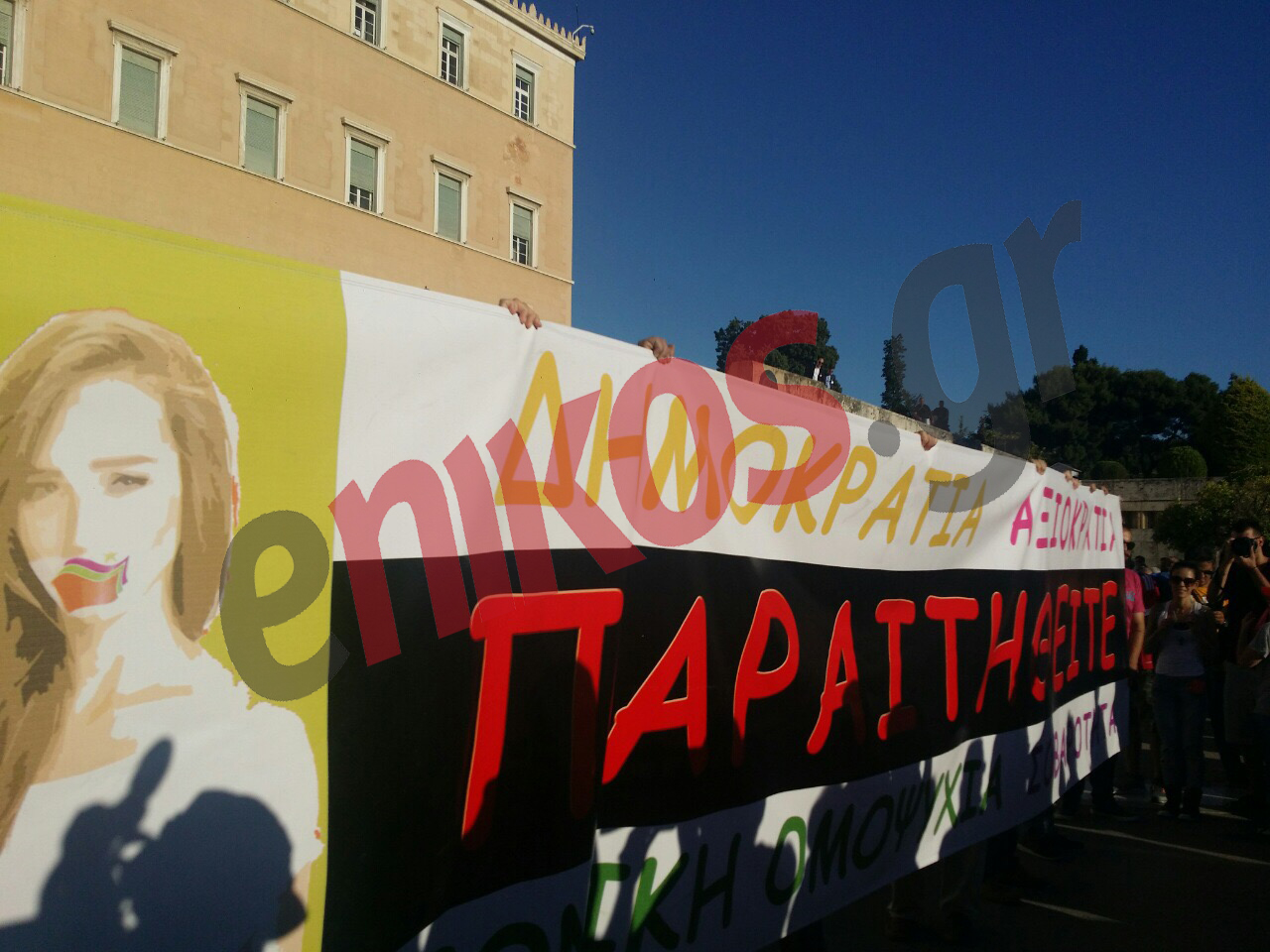 “Καταστρέφετε τη χώρα, φύγετε τώρα” γράφει το πανό που κρατάνε διαδηλωτές μπροστά στον “Άγνωστο στρατιώτη”
