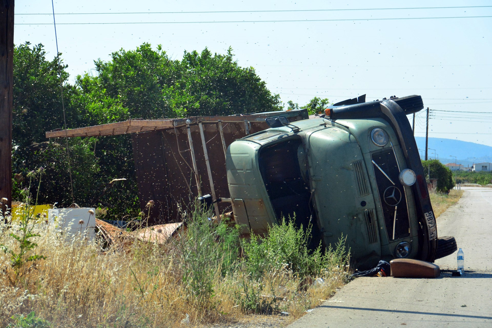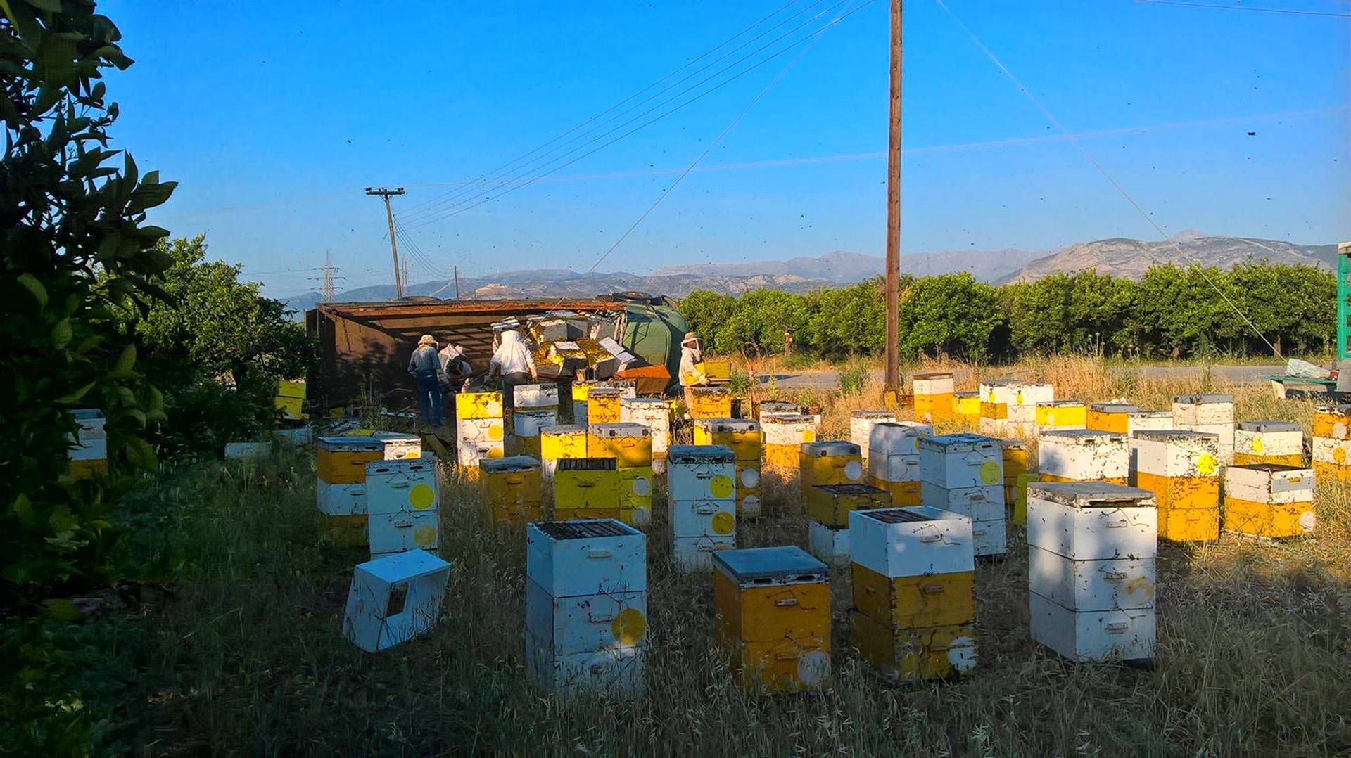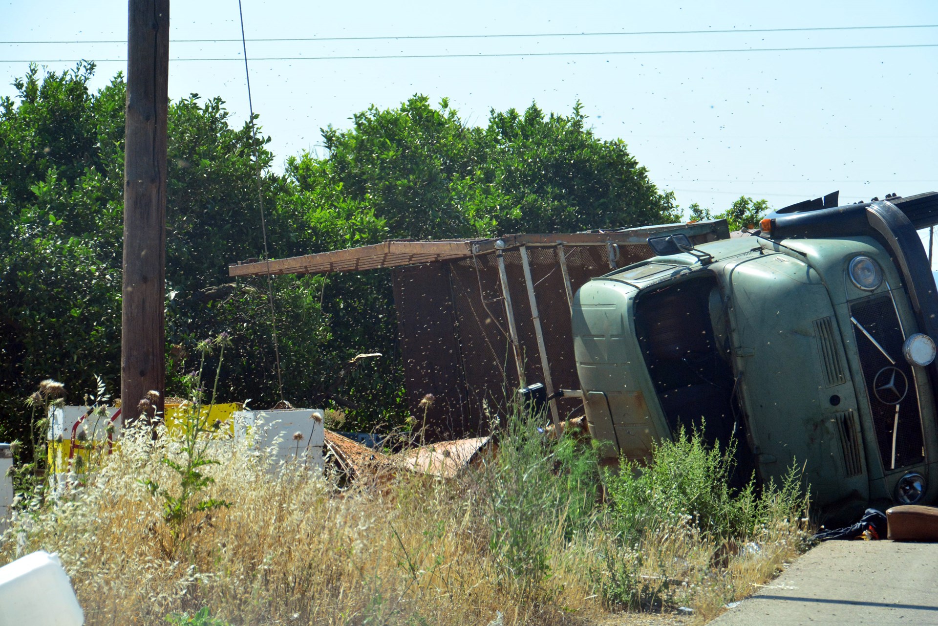 Δεκάδες κυψέλες έσπασαν από την ανατροπή του φορτηγού με αποτέλεσμα να απελευθερωθούν χιλιάδες μέλισσες.