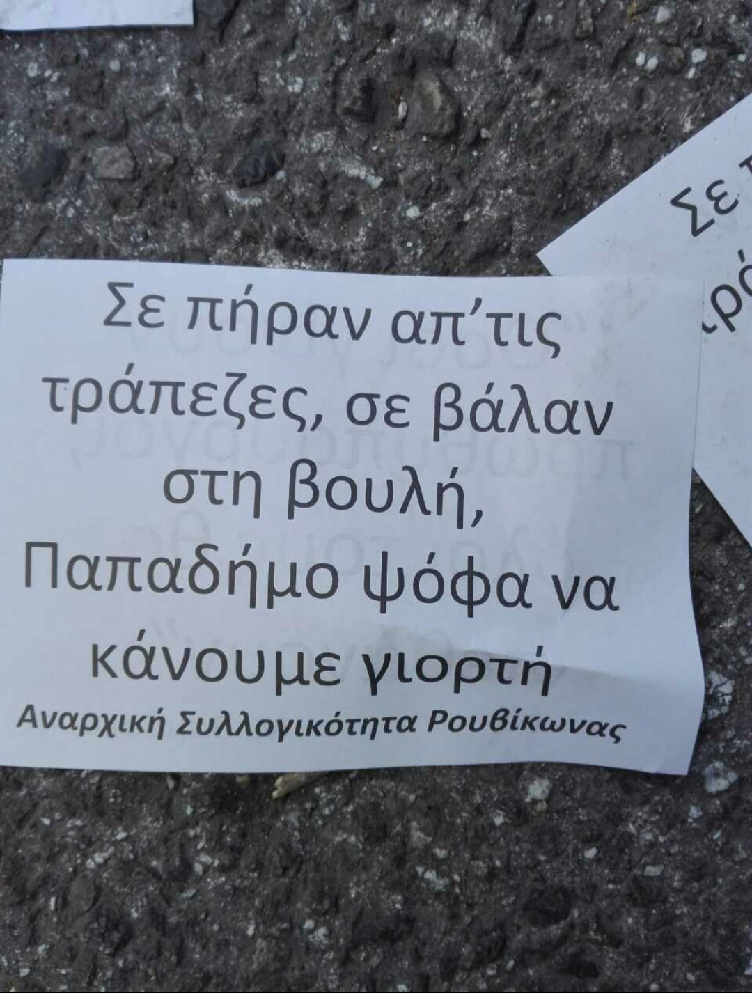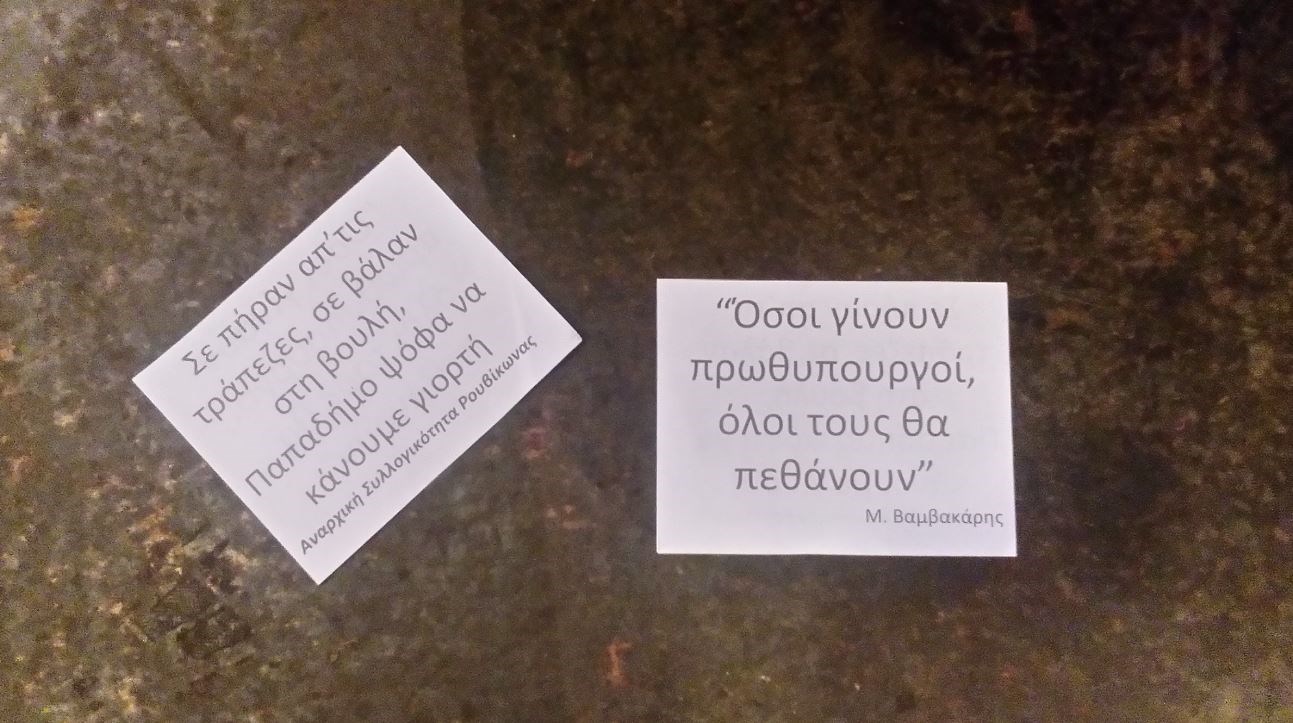 «Σε πήραν από τις τράπεζες, σε βάλαν στη βουλή, Παπαδήμο ψόφα να κάνουμε γιορτή», ανέφεραν τα φέιγ βολάν που πέταξαν τα μέλη του Ρουβίκωνα, τα οποία στη συνέχεια τράπηκαν σε φυγή.